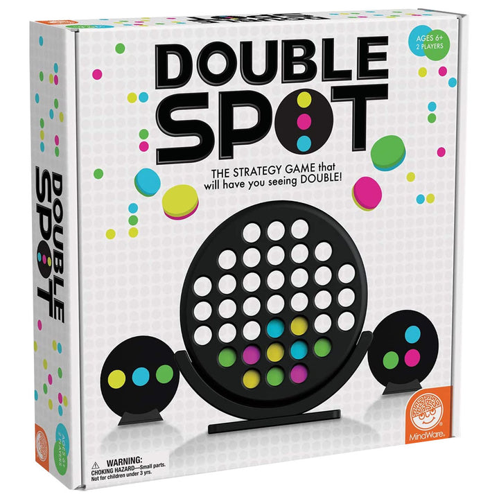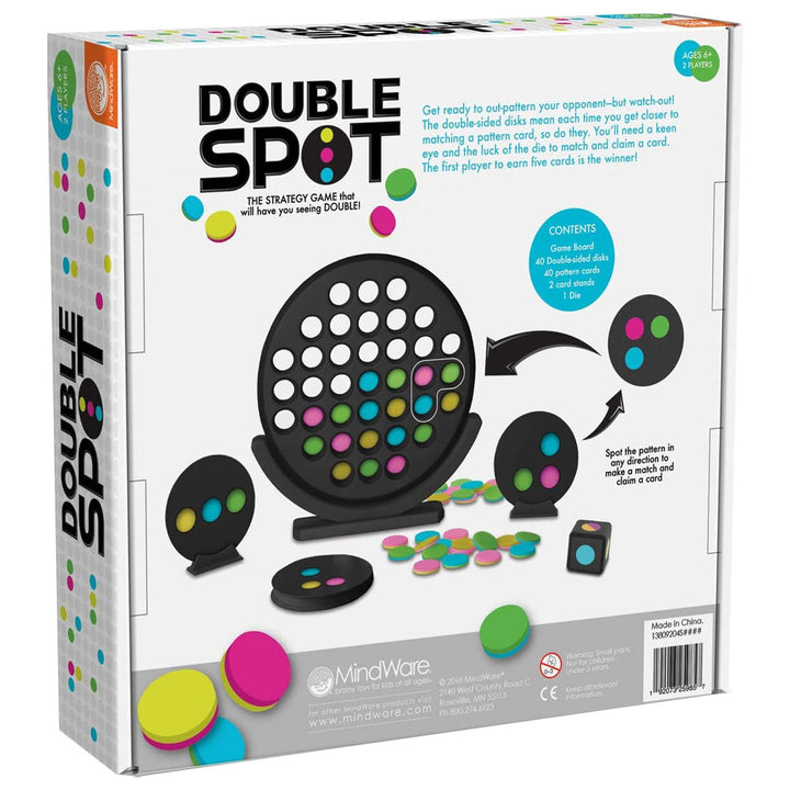 Double Spot is a fantastic strategy game for ages 6 and up. Players work to complete the same patterns at the same time. As you make progress toward matching the patterns on your side of the cards, your opponent will automatically make the same progress toward matching the patterns on his or her side of the cards. You will have to decide when to take a risk and hope the roll of the die is in your favour or that your opponent doesn't see the pattern you are trying to make. This fast-pace strategy game is a great addition to family game nights and will keep players on the edge of their seats!