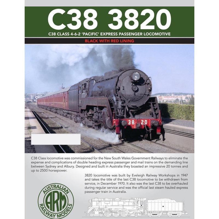 Australian Railway Models HO C38 Class 462 Pacific Express Passenger Locomotive 3820 Black with Red Lining Colour Scheme DCC