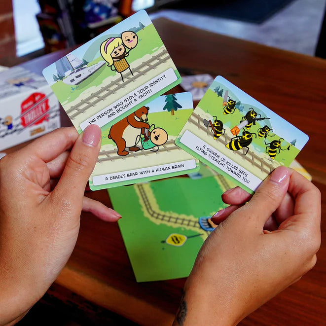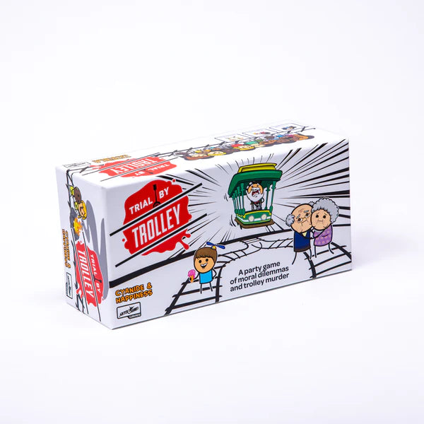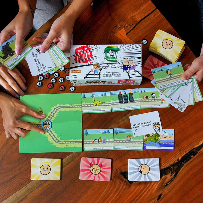 In Trial by Trolley, one player is on an out-of-control trolley speeding toward a fork in the tracks. Everyone else splits into two teams and must use their wits and their cards to convince the Trolley Driver to spare their lives!