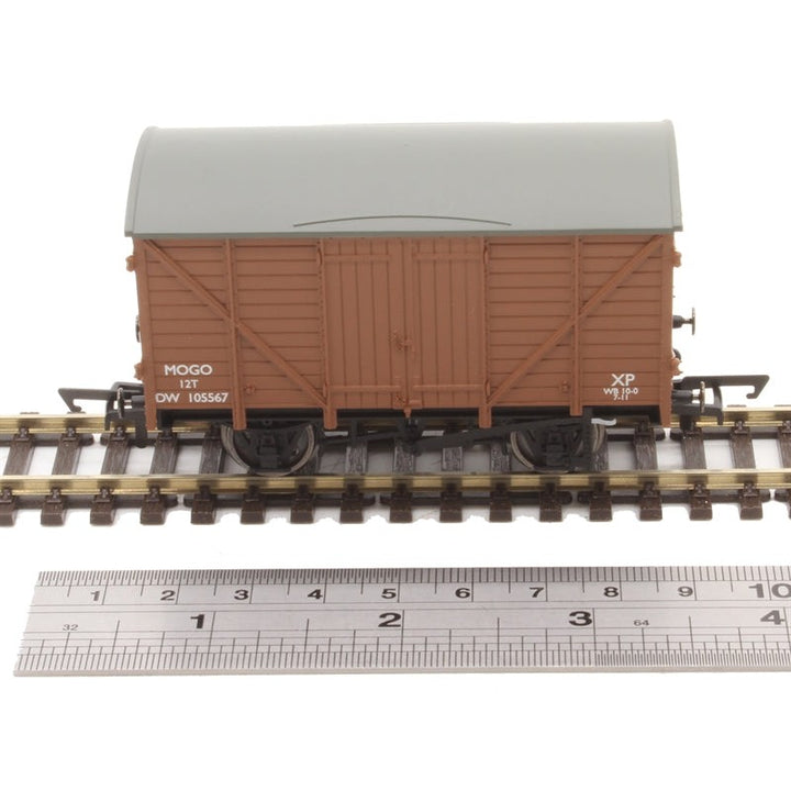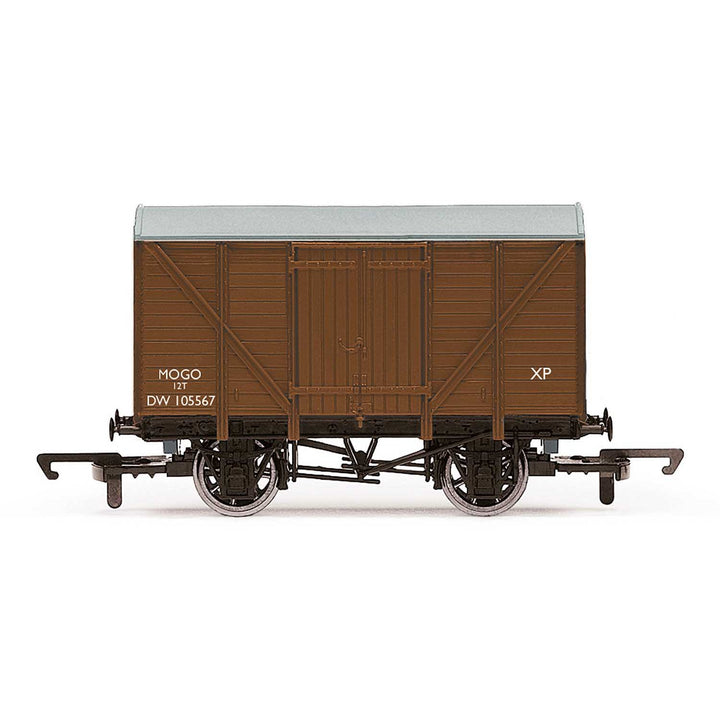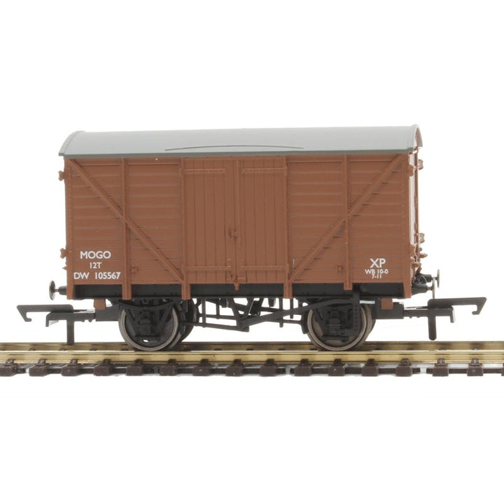 Mogo' vans were railway vans built by Great Western Railway (GWR) in-order to transport motor vehicles. Each van could only take a single vehicle which was loaded by driving through doors in the end of the van. The van additionally featured side doors so that it could be used to transport normal goods if not needed as a motor transporter. 350 wagons were built by GWR with the first appearing in 1933.