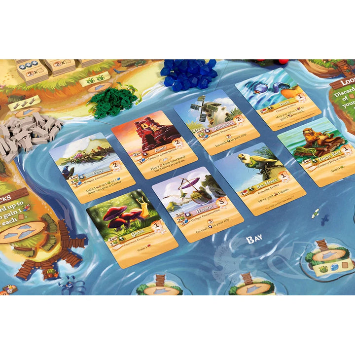 This is the country of Farshore. Through each season, you will be leading a crew of critter workers to build up a prosperous city and to explore the enchanting ocean beyond. You must plan your actions carefully in order to build and to sail, for only by adapting to the winds of change will you succeed.