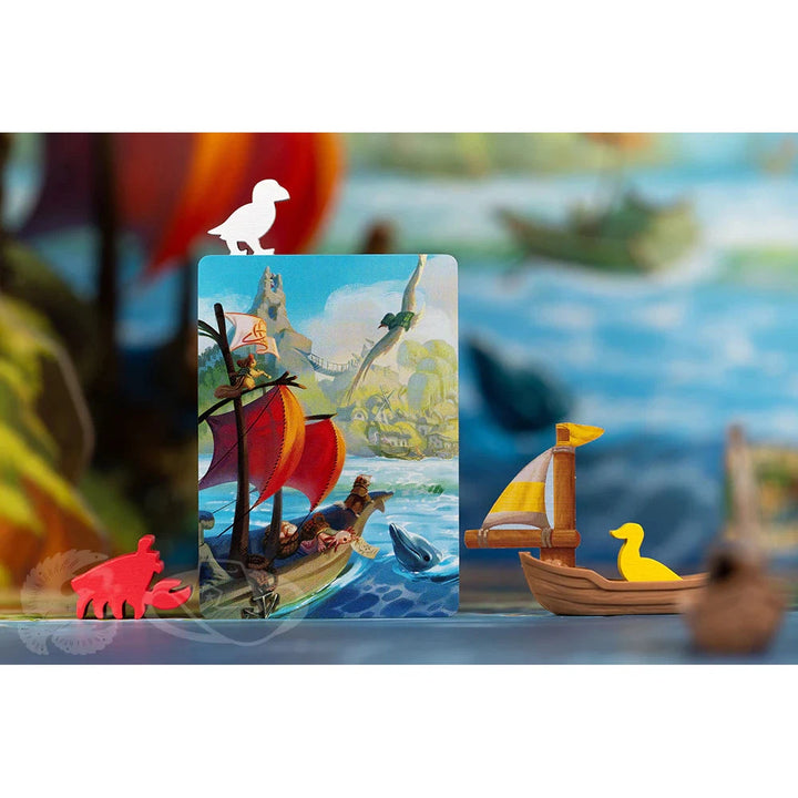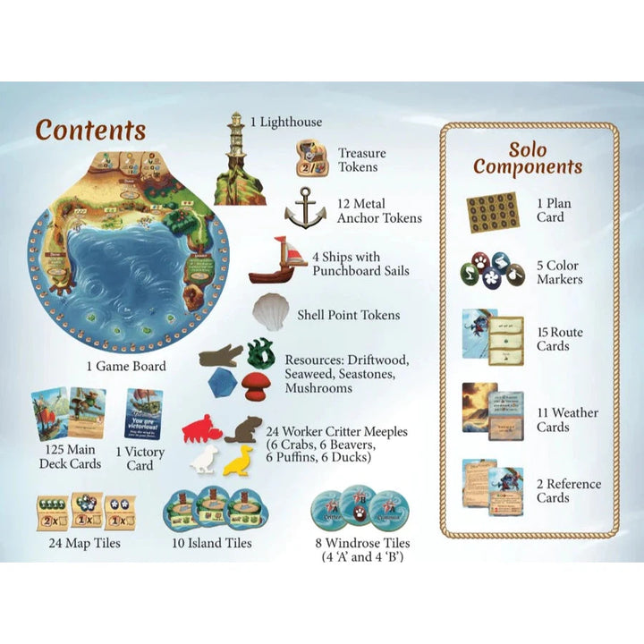 1 Game Board, 1 Lighthouse, Treasure Tokens, 12 Metal Anchor Tokens, 4 Ships with Punchboard Sails, Shell Point Tokens, Resources: (Driftwood, Seaweed, Seastones, Mushrooms), 24 Worker Critter Meeples: (6 Crabs, 6 Beavers, 6 Puffins, 6 Ducks), 12 Main Deck Cards, 1 Victory Card, 24 Map Tiles, 10 Island Tiles, 8 Windrose Tiles (4