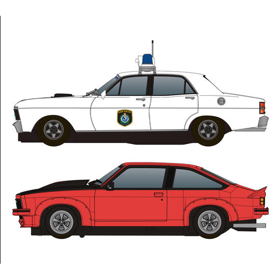 This iconic 5.32-meter Australian Highway Patrol set is perfect for all speed enthusiasts. Who will be the king of the Highway? This Australian exclusive comes with a Holden A9X Torana and Ford XY Falcon police car with working red and blue police lights.