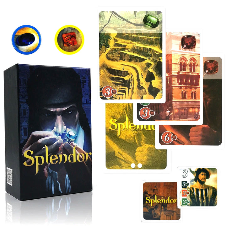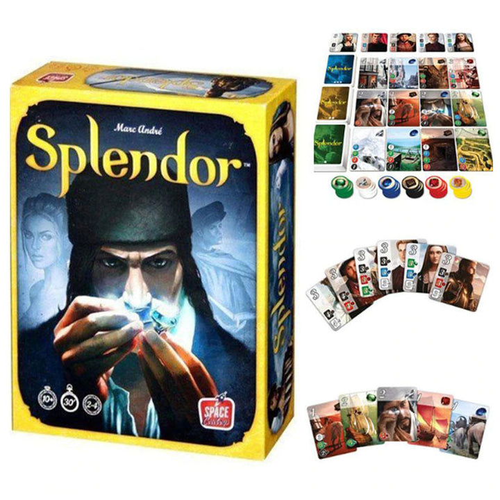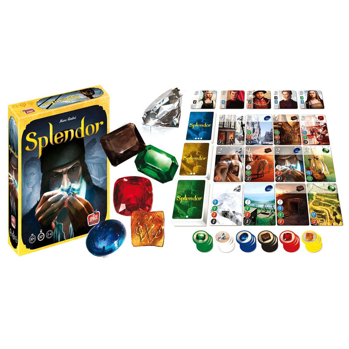 Splendor is a fast-paced and addictive game of chip-collecting and card development. Players are merchants of the Renaissance trying to buy gem mines, means of transportation, shops - all in order to acquire the most prestige points. If you're wealthy enough, you might even receive a visit from a noble at some point, which of course will further increase your prestige.