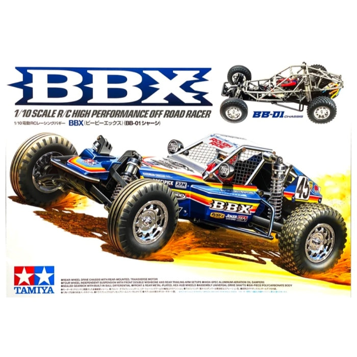 Tamiya’s designers have taken inspiration from its back catalog of iconic 2WD off-road buggies to bring fans of radio control the ALL-NEW BBX! This 1/10 R/C 2WD off-road buggy model features a combination of classic design and modern performance. Its brand-new chassis, reminiscent of 1980’s sand rail dune buggies, is a hybrid monocoque-roll cage and employs rear trailing arm suspension inspired by full-size UTV’s. The new body is designed by famed Japanese artist Atsushi Arino and utilizes a classic 1980’s inspired livery with retro wheels and tires to match!