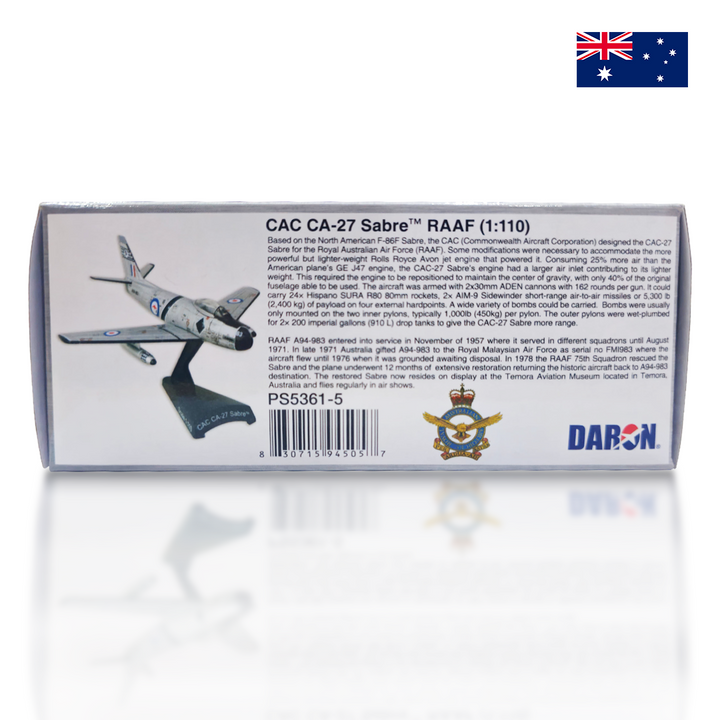 The CAC-27 Sabre was a significant aircraft in the RAAF's history, known for its role during the Cold War era. The livery represents the RAAF's proud heritage and its contribution to air defence. This model captures the essence of the Sabre's service and its place in aviation history.