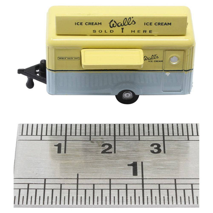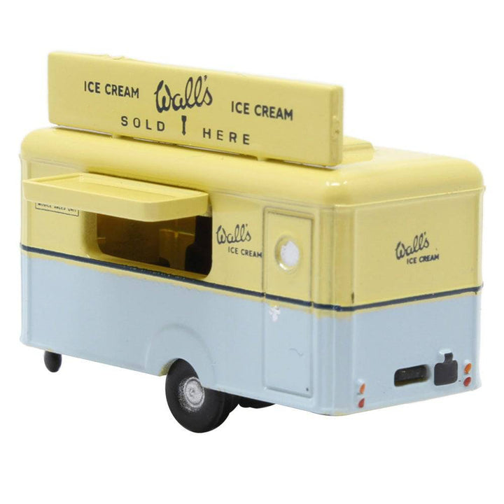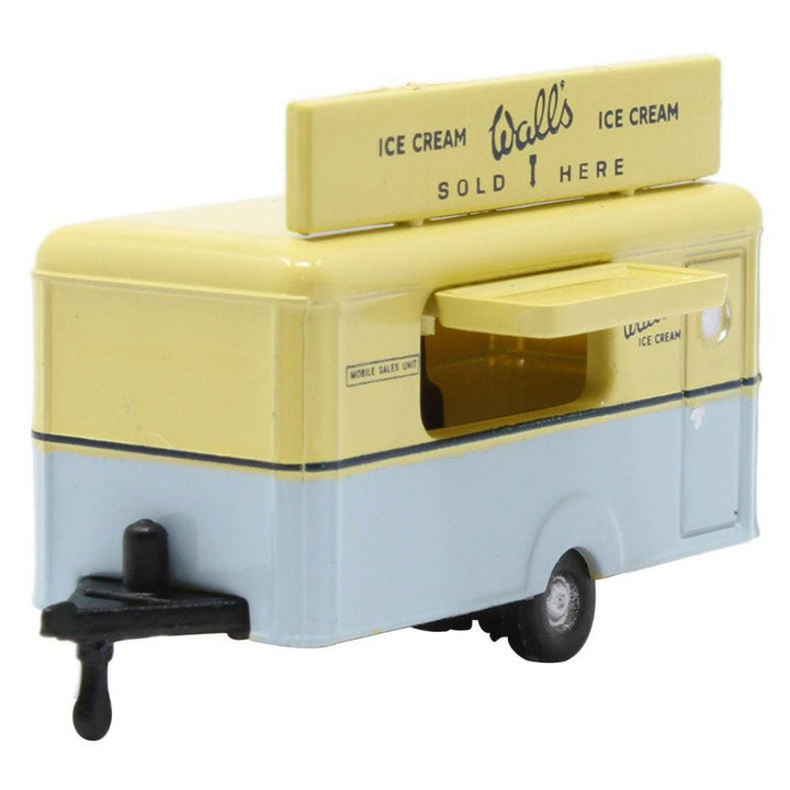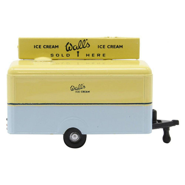 This mobile trailer in the signature cream and pale blue Wall’s Ice Cream livery is completed with jockey wheel hook-up assembly and cream roofboard proclaiming Wall’s Ice Cream sold here.