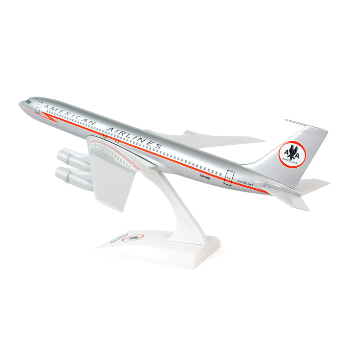 Comprising superior quality, solid injection molded plastic components with a simple snap-fit design that allows for easy assembly without the need for glue, SkyMarks 1/150 Scale American Airlines Boeing 707 measures approximately 12-inches long with an 11-inch wingspan and comes complete with a Display Stand. An accurate, true-to-scale reproduction of the actual aircraft, the model is great for collectors and features authentic, highly detailed graphics and markings. American Airlines flew the Boeing 707 from 1959 until 1979, which it launched on its Los Angeles to New York route as the first scheduled nonstop transcontinental jetliner service operated by any airline. The Boeing 707 was developed as a long range, intercontinental, narrow body aircraft that could carry approximately 200-passengers, and has not only been credited with having initiated the jet age, it was also the most popular jetliner of its time.
