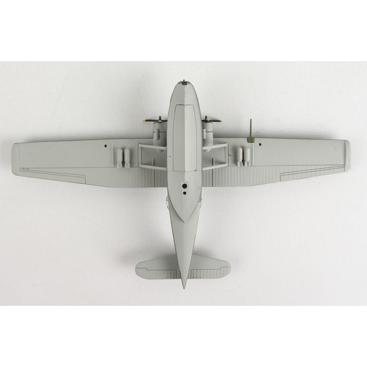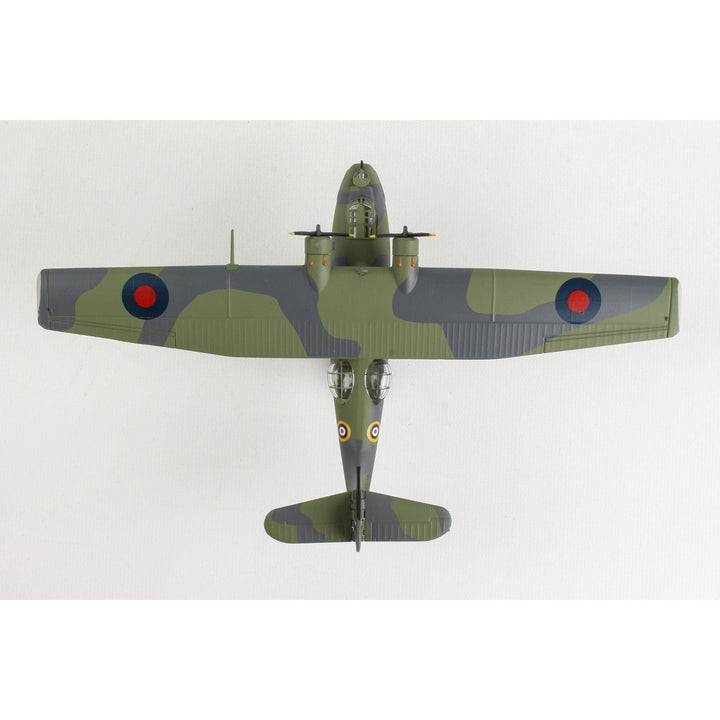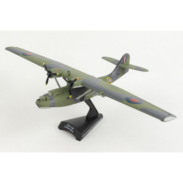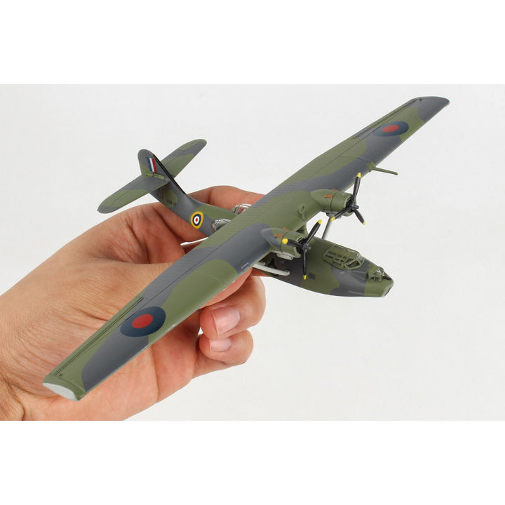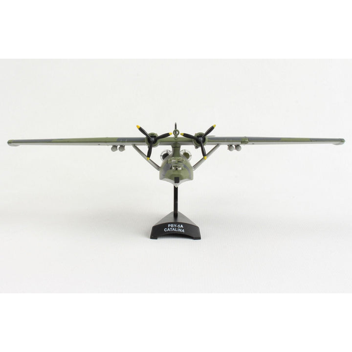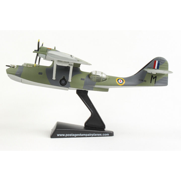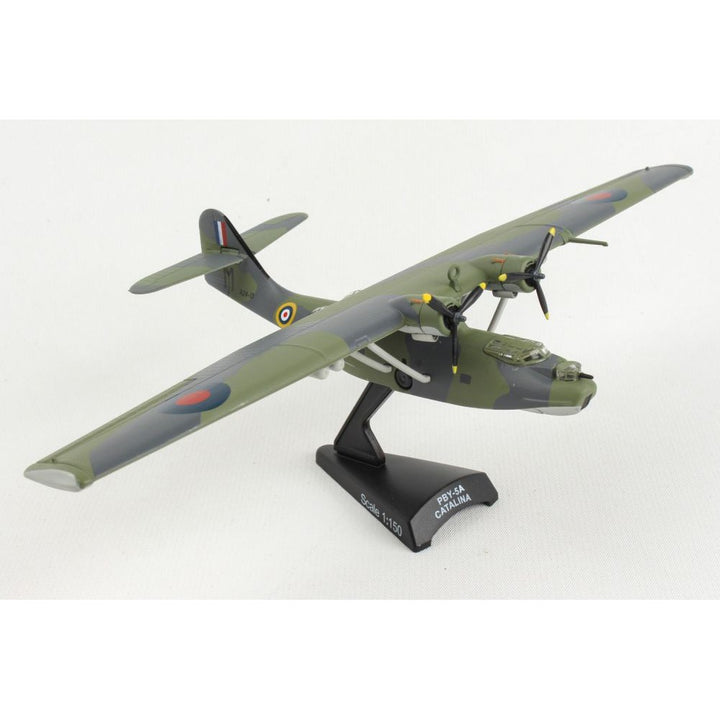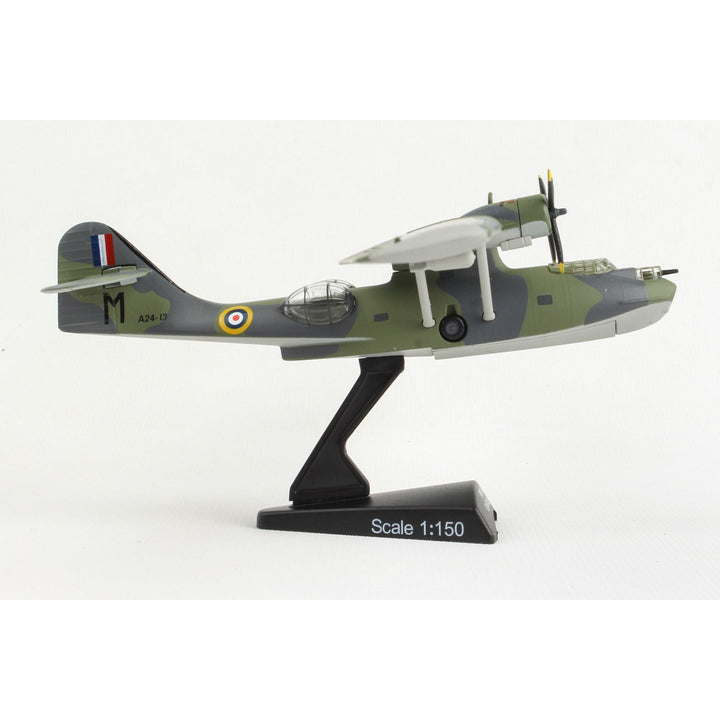 Produced by Consolidated Aircraft, the PBY Catalina was a flying boat which later became an amphibious aircraft, used by several countries in the 1930's and 1940's. It is a long range aircraft, which did not require a runway to operate, as it was capable of both take-off and landing on the water. The PBY's uses included maritime patrol, bombing, anti-submarine warfare, and search and rescue missions. Remembered for their role in rescuing downed airmen, the PBY saved thousands of lives. Catalina airmen referred to their aircraft as the "Cat" on combat missions and "Dumbo" during air-sea rescue. The name Black Cats refers to a select group of squadrons whose mission it was to strike at night. Painting their aircraft matte black, installing special radar and flame dampers over the exhaust ports, and often using only the lights on their instrument gauges to guide them, these squadrons were virtually undetectable at night. This Die-cast metal airplane model comes in 1:150 scale with plastic stand and is approximately 5 1/8 inches long with 8 1/4 inch wingspan.