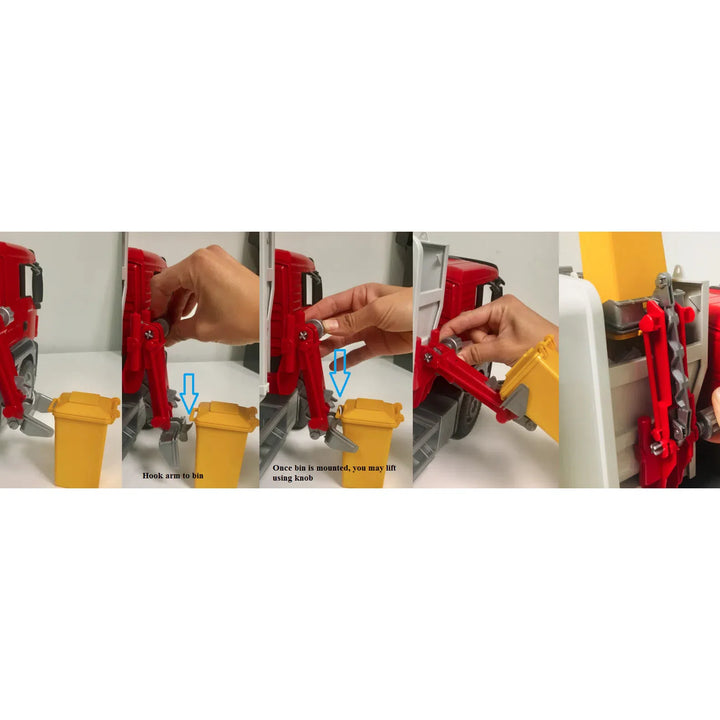 The MAN TGS is the perfect, all-round vehicle for construction sites, long-haul deployment and local distribution. Thanks to durable design, featuring powerful engines and providing an over-average payload, this truck is the prototype of the frequently described "all-round vehicle" with plenty of innovations on board. A lifter unit moves out at the side to grab bins and empty them without the need for a second person. Two screw-type compactors move the waste on the inside of the loading body towards the rear. After having opened the tailgate, the body tilts to empty out the vehicle. Our small dustbins from set 02607 match this refuse collector vehicle. Thanks to this detailed toy children can realistically discover the exciting tasks involved in refuse collection and recycling – "just like the real thing".