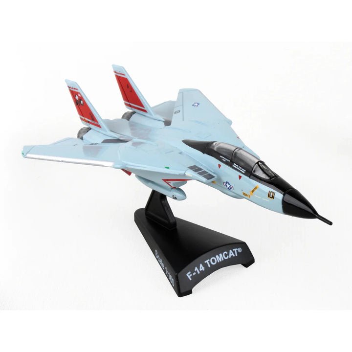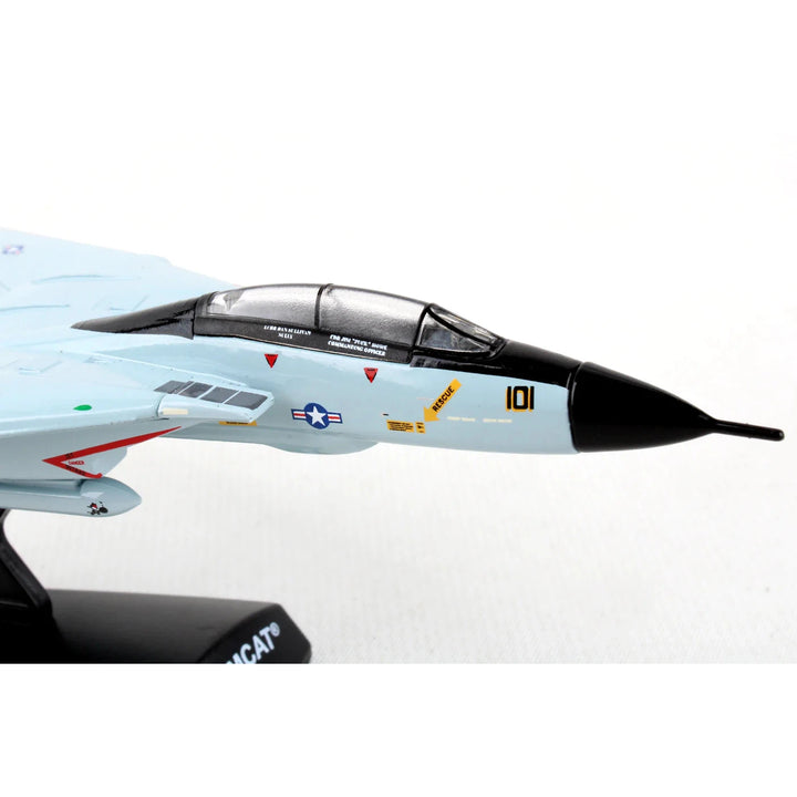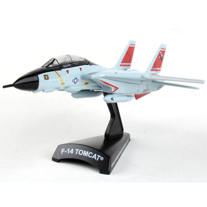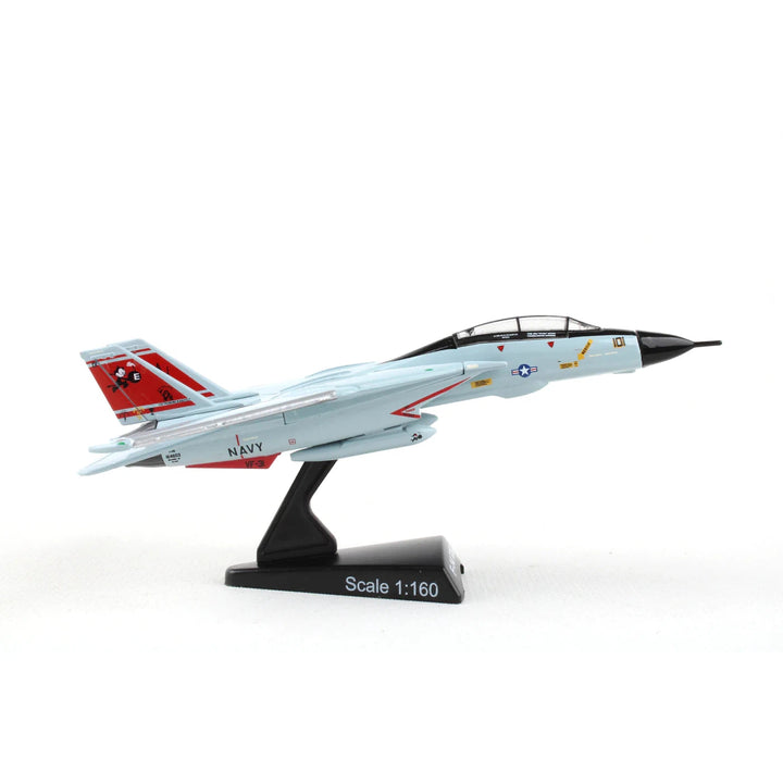 Model is approximately 4 3/4 inches long with 2 7/8 inch wingspan. Wings are stationary. Adult Collectible ages 14+ The F-14 Tomcat® is a supersonic, long-range, high-endurance interceptor fighter aircraft operated by the US Navy as their primary air superiority fighter and to defend its carrier battle groups against anti-ship missiles. The F-14 has a two-seat cockpit with a bubble canopy that affords all-round visibility. It features variable geometry wings that swing automatically between 20° and 68° during flight. For high-speed intercept, they are swept back and they swing forward for lower speed flight and landing.