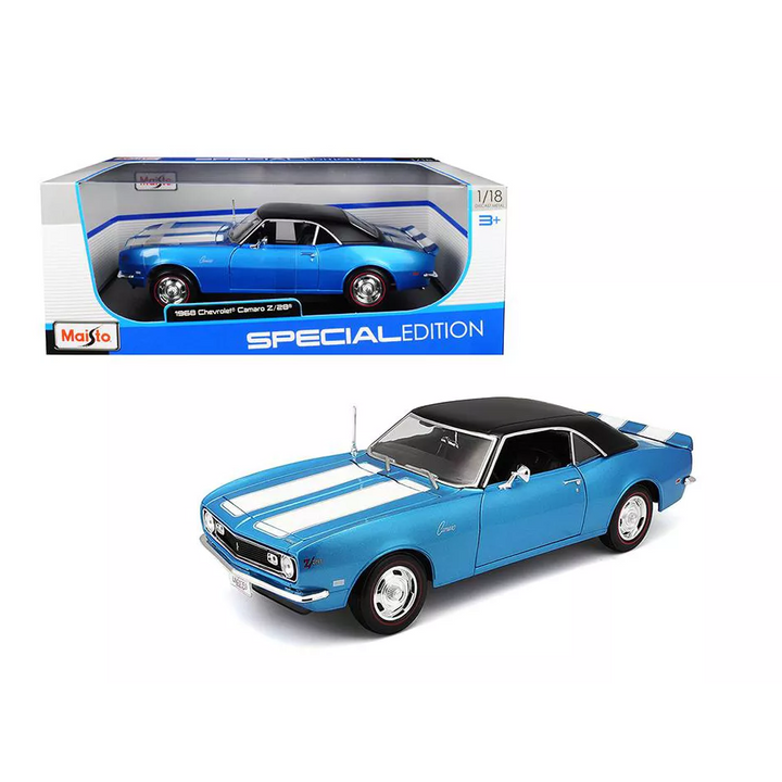 The Z/28 is a first-generation Camaro that comes fully equipped to blow away the competition! When Chevrolet engineers decided to release a "race-ready" version of the Camaro to the public, the Z/28 is what they came up with. With a full performance package and a specially designed small-block V8 engine, this is one baby that's ready to roll! This 1/18 scale diecast model of the classic 1968 Chevy Camaro Z/28 comes in glowing blue with white racing stripes, and features openable doors, hood and trunk, and finely detailed motor and interior. Great for any classic sportscar collection.