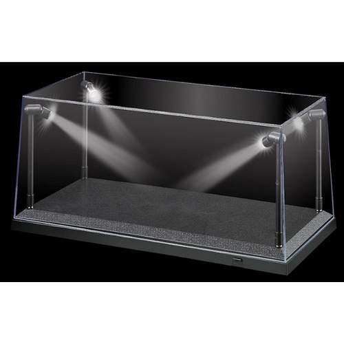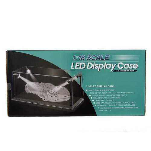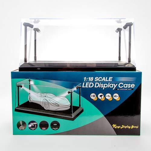 King Creation 1/18 Scale Exclusive USB LED display case (car not included) with four Ultra bright Led lights Adjustable light Use 4 "AA"alkaline batteries (Not included) or use a Micro USB cable (included) Clear plastic display cover with base. Can be stacked for additional display case.