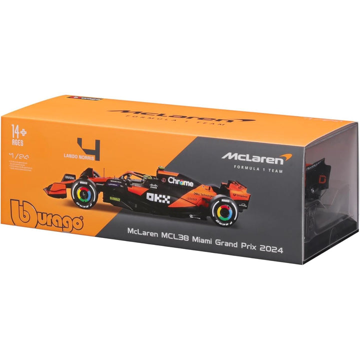 1/24 2024 F-1 McLaren MCL38 #4 Norris in Showcase by Bburago delivers thrilling display value for Formula 1 enthusiasts and McLaren fans.