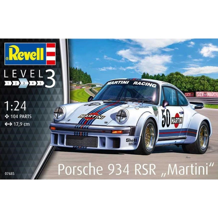 1/24 Porsche 934 RSR Martini by Revell delivers iconic 1970s racing style for automotive modelling enthusiasts.