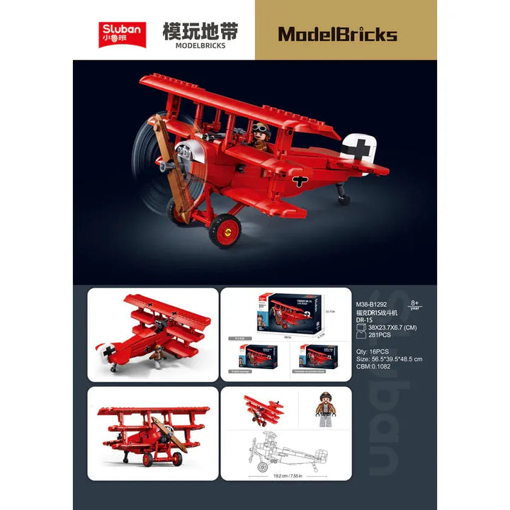 Construct a piece of aviation history with the Sluban 1/35 281pc MB WW1 Fokker DR-1S building set. This set allows you to recreate the legendary Fokker Dr.I triplane, famously flown by Manfred von Richthofen, the "Red Baron," during World War I.