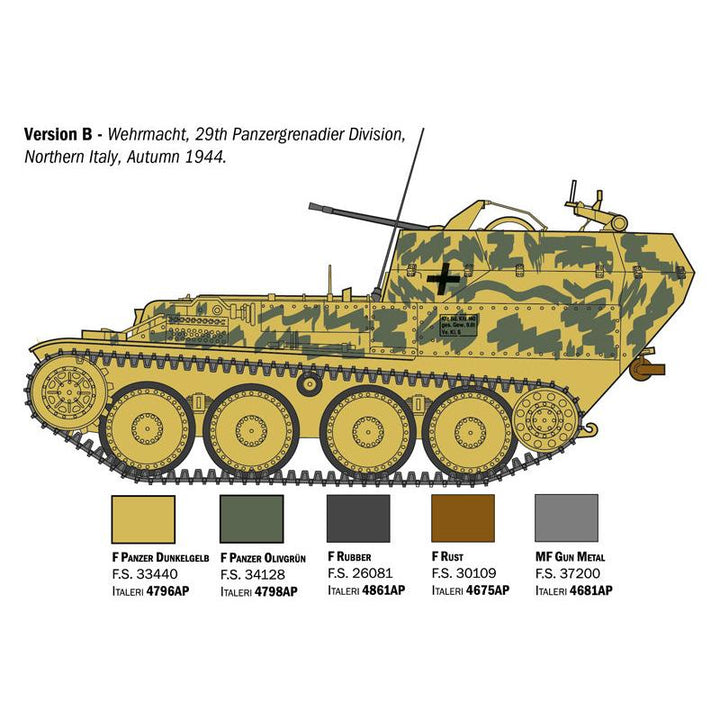 This mobile anti aircraft weapon was made for the German army in 1943 to provide battlefield protection for their forces subject to sustained attack by enemy planes. The vehicle was developed, based on the 38T tank chassis, of Czechoslovakian origin already widely employed as the basis for reconnaissance and mobile artillery units. The Gepard carried a 2cm cannon, FLAK 38 and although well armed did not alone deliver the amount of fire needed to protect a location under attack and so it was necessary to deploy them in groups for effective defence. Total production amounted to 140 before manufacture ceased in early 1944.