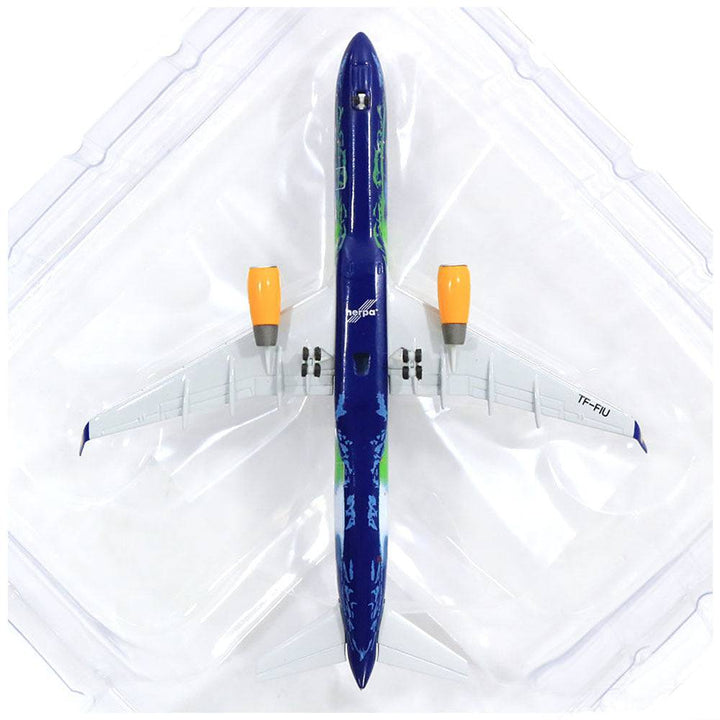 More than 170 individual imprints and over twice the usual production time are needed to transpose one of the most astonishing special liveries in aviation into the 1/400 scale. Icelandair has created a unique color scheme with snow-covered mountains and the polar lights that poses a great challenge in the 1/500 and even more so in the larger 1/400 scale.