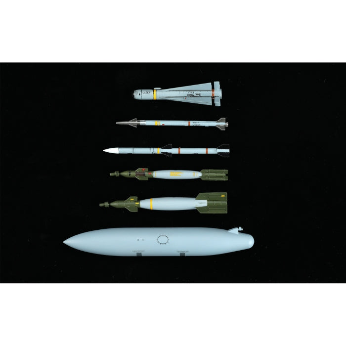 This MENG LS-016 1/48 Boeing F/A-18F Super Hornet Bounty Hunters model kit accurately reproduces the exterior features and details of the real aircraft. Flaps and slats can be installed in retracted or deployed positions. Horizontal stabilizers and rudders are movable. The cockpit and its interior equipment are precisely replicated. The specially designed pluggable main pylons allow the easy change of weapons; this kit includes AGM-65 anti-radiation missiles, GBU-12 and GBU-16 laser-guided bombs. This kit includes two U.S. Navy pilot figures, pre-cut stainless steel PE parts and pre-cut painting masks. It provides three high-visibility and low-visibility paint schemes of the VFA-2 Bounty Hunters Squadron.