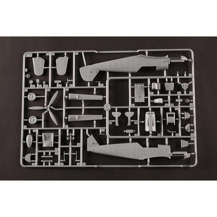 Clean up the parts from the sprues, paint major assemblies (wings, fuselage, cockpit), apply modelling glue to join components, install canopy and landing gear, affix decals, and finish with a clear coat or subtle weathering. Display the completed model on a shelf or in a collection case to showcase its classic fighter profile.