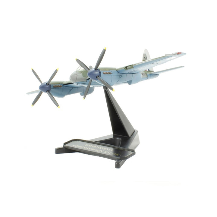 This military version of the DH Hornet is a replica of the fighter aircraft based in Hong Kong in 1953, where it was deployed as part of 80 Sqn's duty to defend Hong Kong from perceived Communist threats during the Chinese Civil War. The de Havilland Hornet and the squadron remained there until May 1955. No 80 Squadron was formed in 1917, firstly as part of the Royal Flying Corps and then the RAF. It served in both World Wars, finally disbanding in 1969. Our replica comes in RAF grey and green camouflage with grey/blue underside and dark blue propeller spinners. The squadron roundel is interesting, being a red rectangle with a yellow diamond shape encasing the usual RAF insignia and features on both sides of the fuselage. The normal RAF roundel also appears on the upper and lower wings. The model also carries the added detail of two underwing bombs and both retracted and extended undercarriage options.