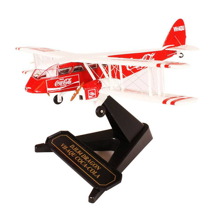 Description The De Havilland 84 Dragon bi-plane from the 1930s will certainly brighten up your Oxford Aviation skies! Appearing in a highly visible white and red colour scheme, almost every surface is promoting that world-famous drink Coca Cola. A slight modification from our first release sees our Coca Cola liveried model without wheel spats. Whether you are a 1930s aviation collector or a Coca Cola enthusiast, this is a very different model to add to your Oxford line-up!