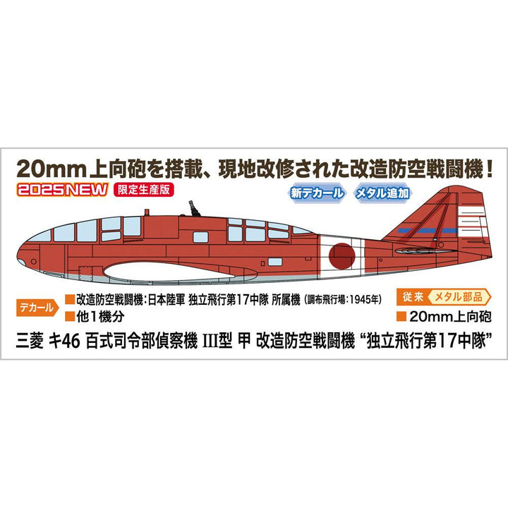 The Mitsubishi Ki-46 ""Dinah"" was a high-speed reconnaissance aircraft used by the Imperial Japanese Army during World War II. It was known for its speed and its ability to evade Allied fighters. The Ki-46-III Koh was a specialized interceptor version, equipped with upward-firing guns to attack enemy bombers. This model kit allows you to build a replica of this important aircraft, commemorating its role in the Pacific War.