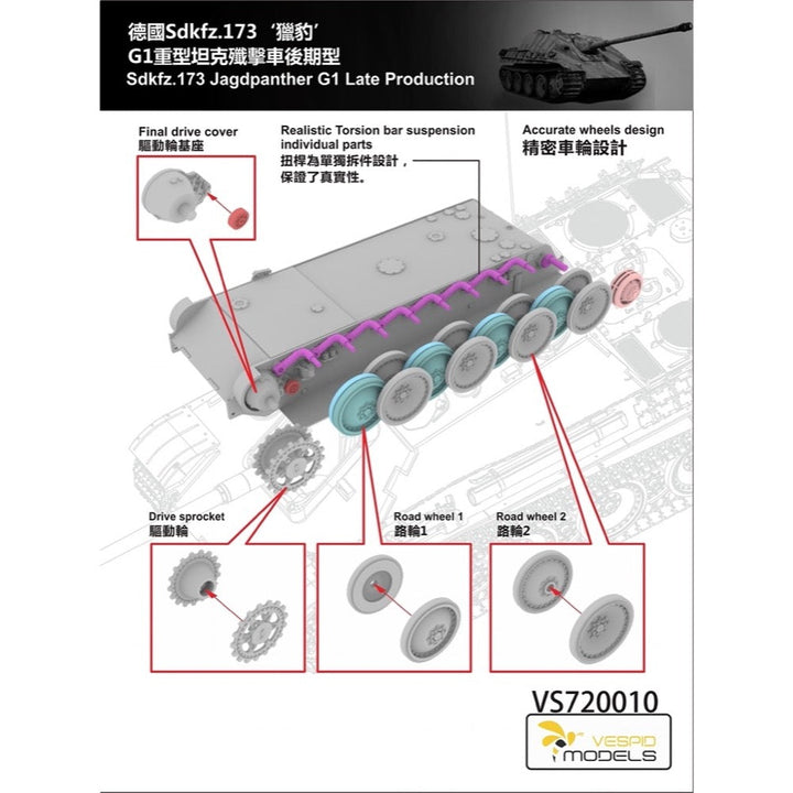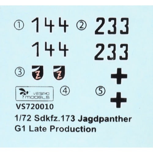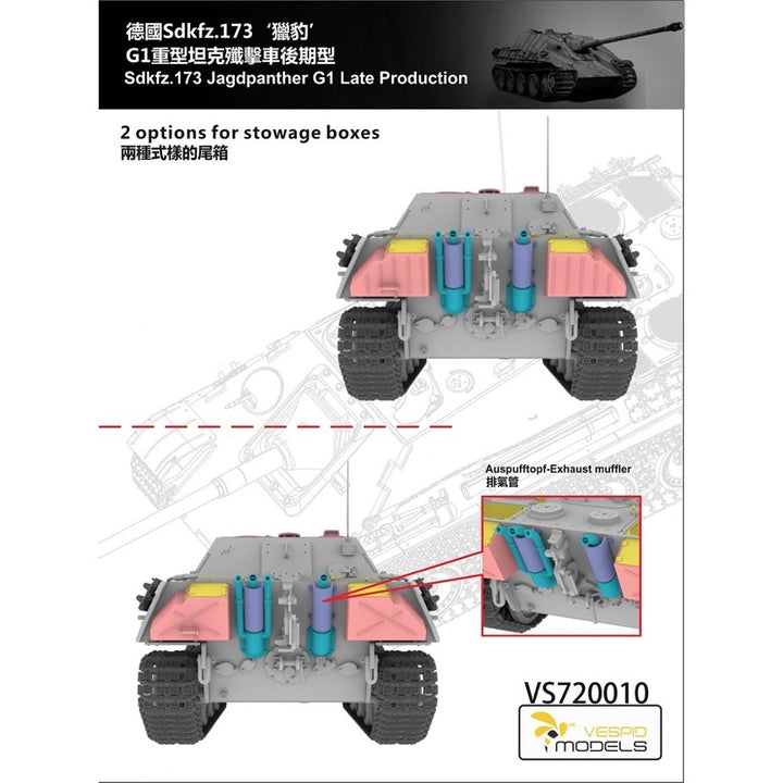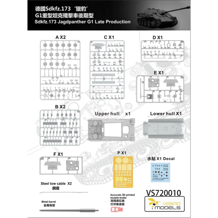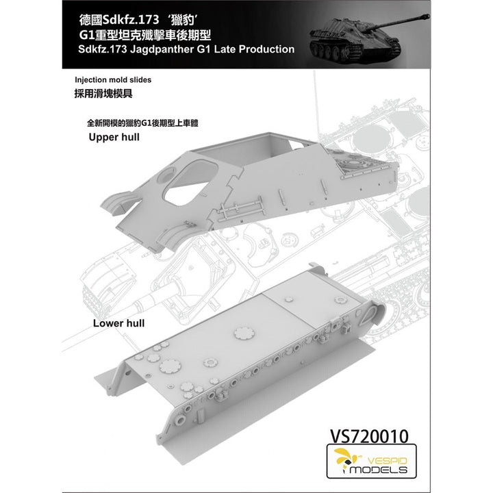 The Jagdpanther is a German tank destroyer built on the chassis of a Panther medium tank; it was equipped with a 71-caliber 8.8cm anti-tank gun PaK43/3. It was a well-balanced tank destroyer with excellent firepower, defense and mobility, and was more reliable than other German heavy tank destroyers. The G1 is a vehicle whose layout of the upper part of the engine section was the same as the Panther A type. This model kit features a large armor collar that is joined from the outside with four bolts on the top and bottom. The main hatch can be opened and closed; the tracks are link-and-length, and photo-etched parts and decals are included.