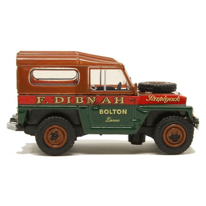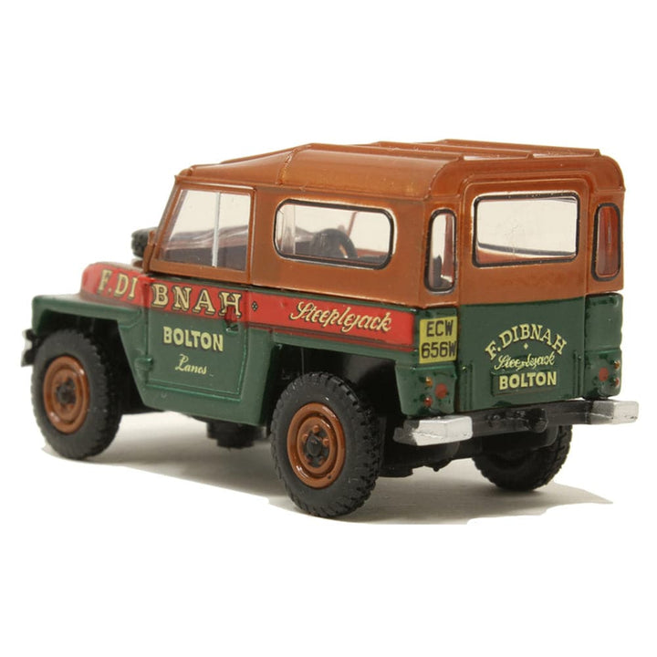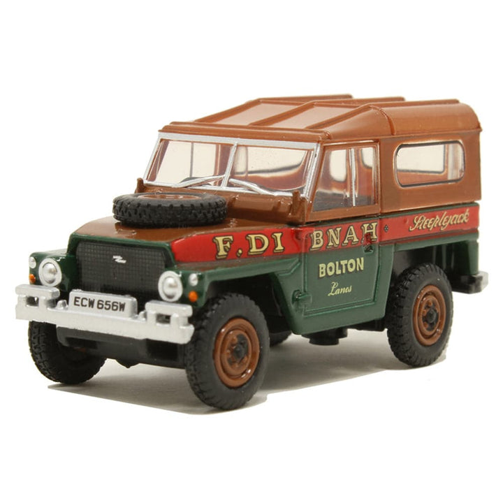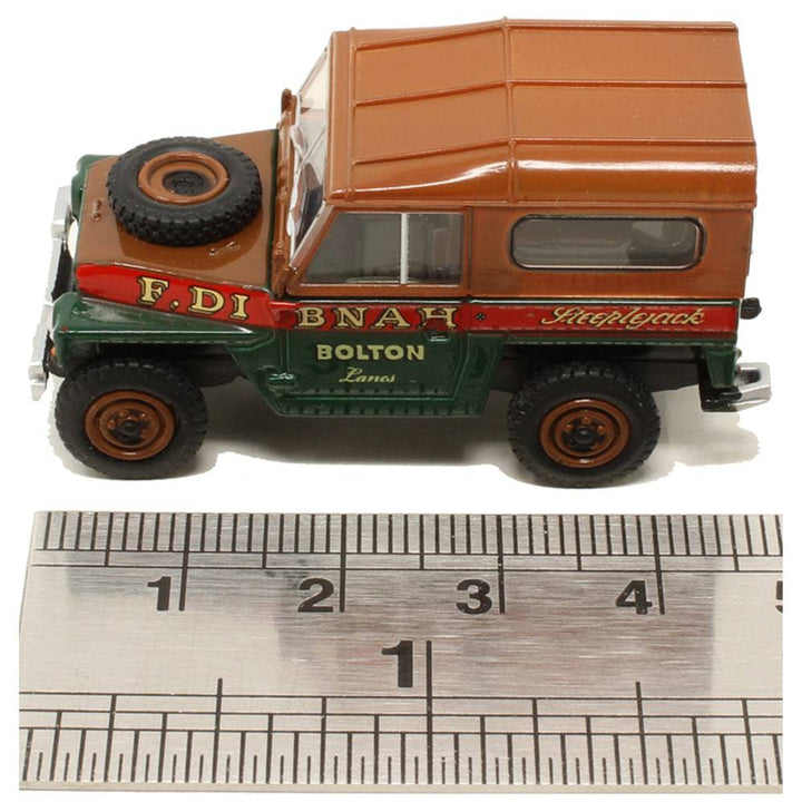 Fred’s famous Land Rover modelled here in 1:76 scale is registered ECW 656W from 1980/81. It is decorated in red and green with a roof, bonnet and wheel centres masked in light brown. Fred’s business name is printed in cream along the sides and rear of the vehicle. The interior is moulded in the same green as the lower body with remaining exterior trim masked black.