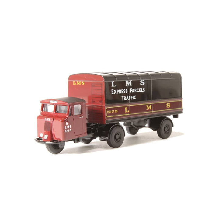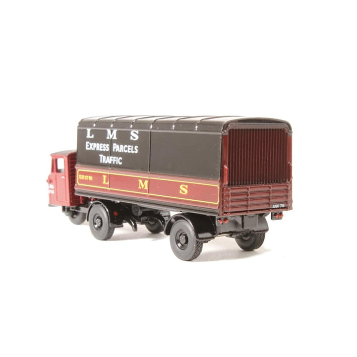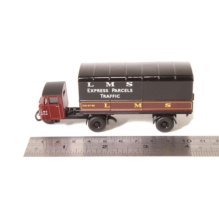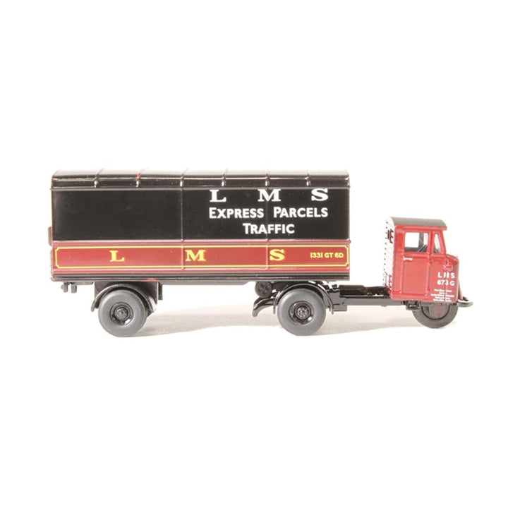 Bound to be snapped up by 00 gauge railway enthusiasts, particularly those favouring London, Midland & Scottish from any era, this newly liveried Scammell Mechanical Horse Trailer is employed as an Express Parcels Traffic vehicle. Registered ANK 715, the three wheeler cab section is maroon with white LMS lettering. The trailer is also maroon on a black chassis, with the upper sides and roof painted black. The lower sides of the trailer carry the LMS lettering in yellow with ‘LMS Express Parcels Traffic’ printed white against the black upper body. The Scammell was synonymous with railway goods yards for decades with LMS being one of the Big Four prior to the nationalisation of the railways.