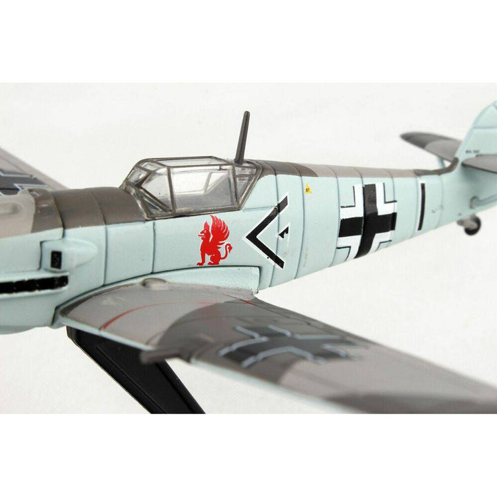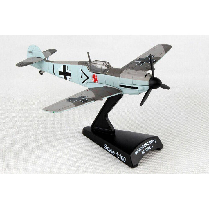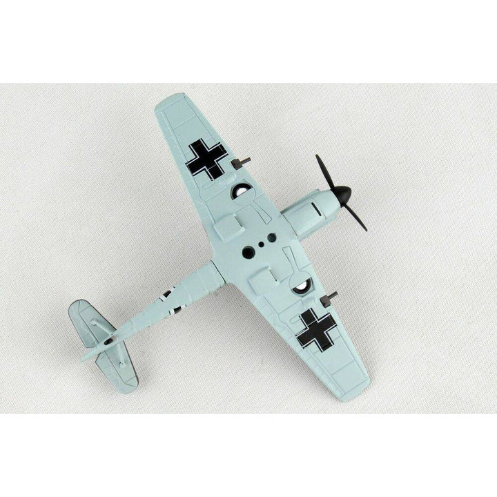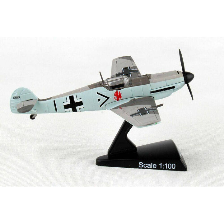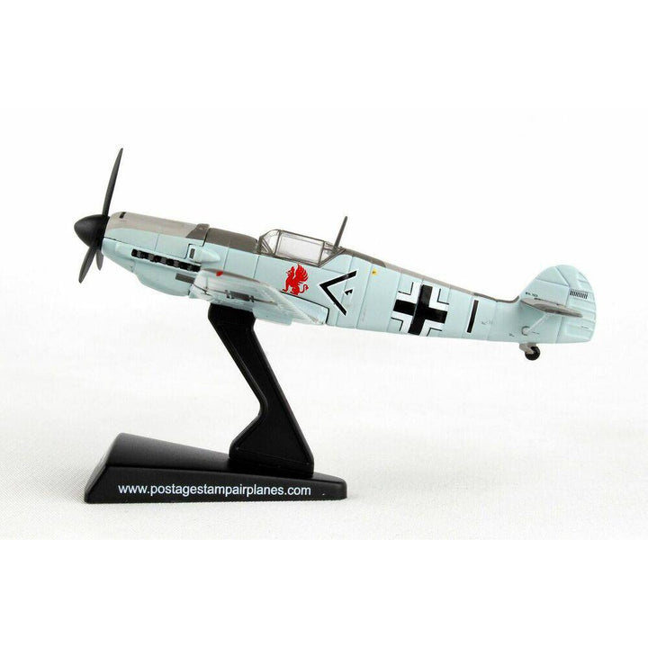 Postage Stamp plane models (formerly known as Model Power models) has a long history of producing affordable, ready made diecast airplanes in the 5" to 8" range. The Messerschmitt Bf-109 was a single-seat fighter aircraft used by the Luftwaffe's fighter force from 1936 through to the end of World War II. Its aerodynamically sophisticated design made it an exceptionally potent adversary, and it remains the most produced fighter aircraft in history. This model represents the Bf-109 flown by German air ace Adolf Galland in 1940 during the invasion of France and the Battle of Britain, by the end of which he had destroyed 58 enemy planes. In November 1941 he was promoted to the post of commander of the Luftwaffe's Fighter Arm, and a year later he was promoted to major general – at 30, the youngest general in the German armed forces.