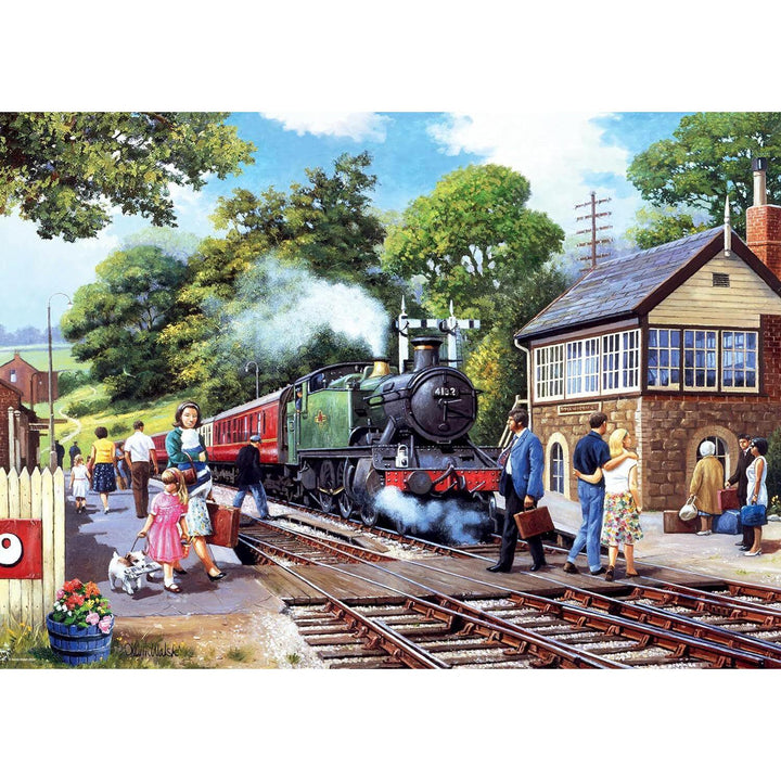 This intricate 1000 piece jigsaw puzzle invites you to explore the timeless charm of a vintage country railway station, where history and the simple pleasures of life converge. As you delve into this captivating puzzle, you'll be transported to a quaint countryside station frozen in time. The puzzle's image captures the essence of a rustic train station, complete with a weathered platform, a vintage locomotive, and a charming station house with a slate roof. The scene is alive with intricate details, from travelers waiting with luggage to the station's personnel bustling about their duties.