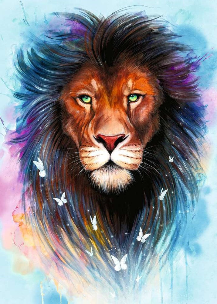 This dramatic portrait of the King of the Lions combines a love of nature with a contemporary art style and colour palette. The soft background tones of blue, pink and peach contrast against darker tones used in the lion. His magnificent mane appears to blow in the wind, and little butterflies flutter around him. His bright green eyes stare out at us, drawing us into the image and holding our attention. If you're looking for a puzzle that's a little different - and would look great completed and framed - this could be the one for you!