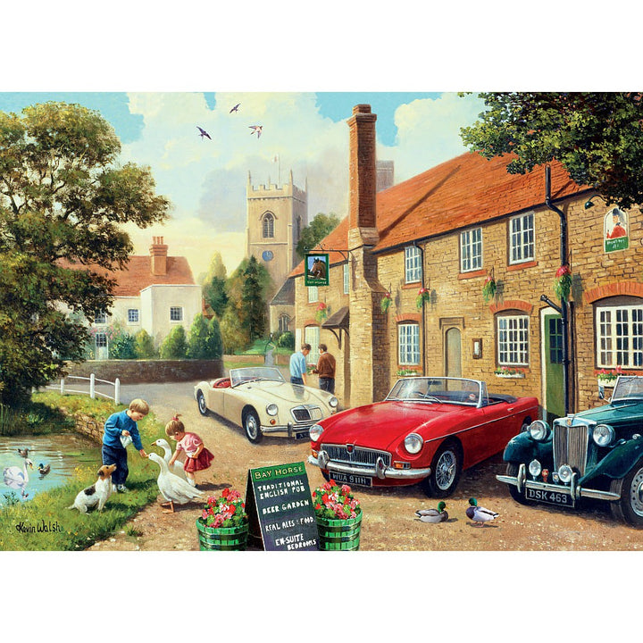 Kevin Walsh nostalgia collection The Village Pub, 1000 piece jigsaw puzzle. Kevin Walsh is best known for his beautiful paintings of nostalgic British scenes which include such famous images as Flying Scotsman, Windsor Castle, the original Queen Mary and the Seaside.