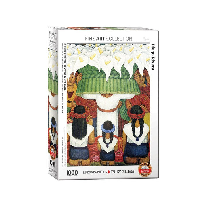 EuroGraphics Flower Festival Feast of Saint Anita by Diego Rivera 1000-Piece Puzzle. Diego Rivera was a prominent Mexican painter. Flower Festival follows his signature of using simple forms and vivid color. EUROGRAPHICS puzzles are both fun and educational. Puzzle pieces are made from 1.75mm blueboard, and are 100% recyclable, and printed with vegetable-based inks. Finished Puzzle Size: 19.25" x 26.5".