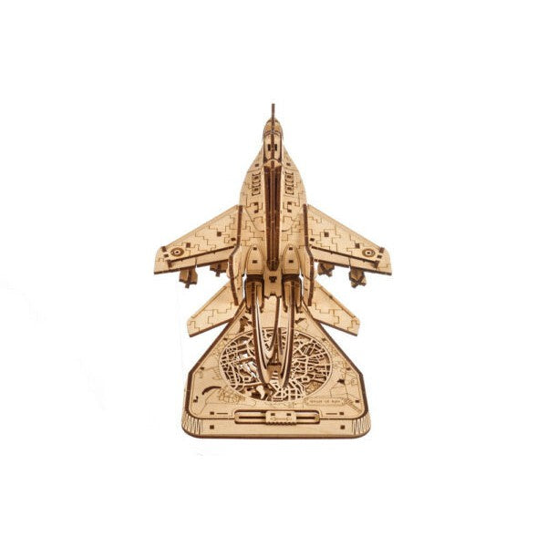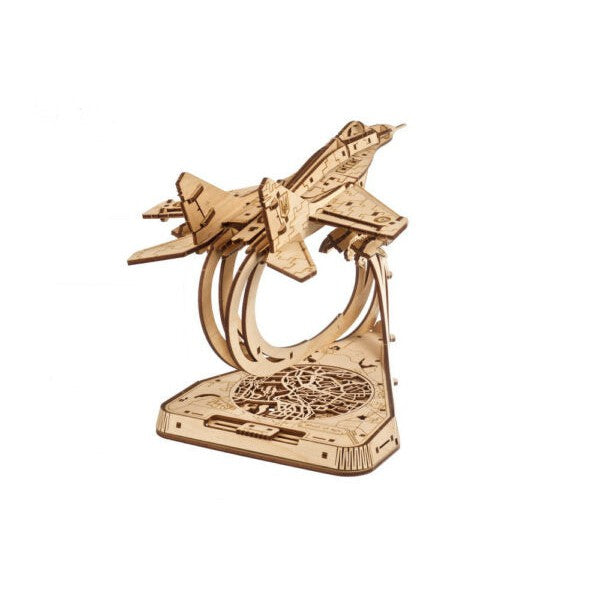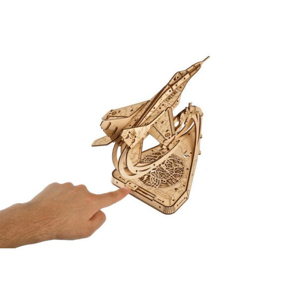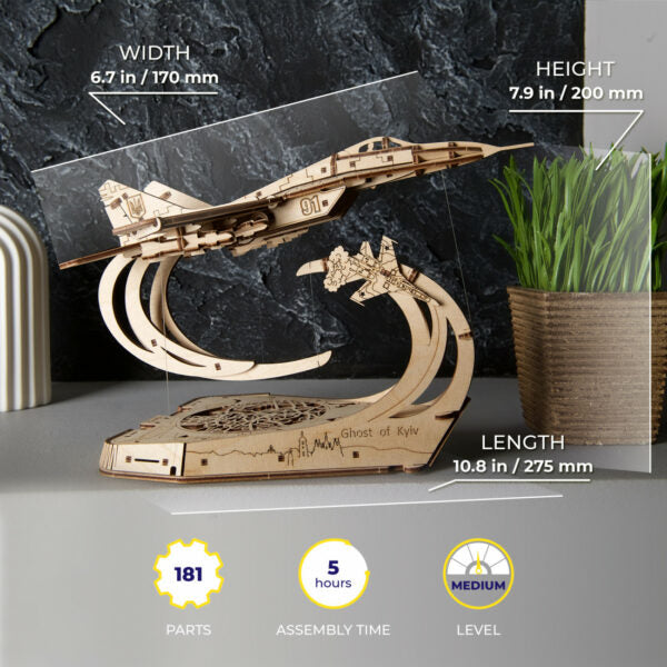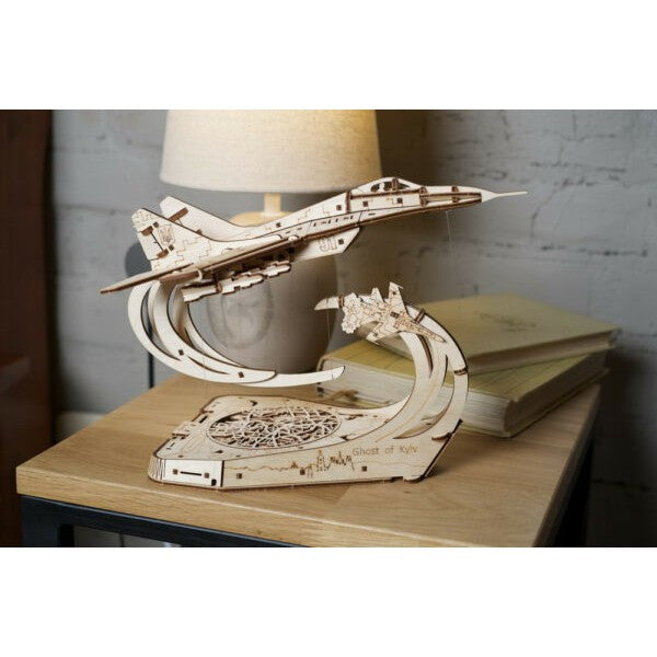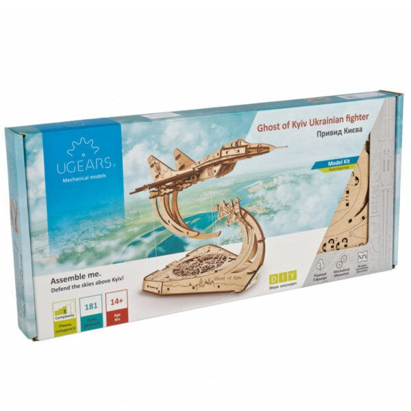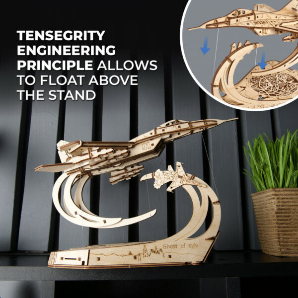 Ugears, a proudly Ukrainian company, brings the Ghost of Kyiv to life in this 1:72 scale model of the MiG-29 fighter jet flown by the Ghost. The model is distinguished by its realism, with movable ailerons, wing flaps, and tail rudders, retractable landing gear front and back, detachable missiles, and pop-up canopy. But the standout feature of this DIY 3D wooden aircraft model is the way it hovers in the air like a phantasm, thanks to our use of tensegrity (tensional integrity or floating compression), an elegant structural engineering principle used in some bridges and stadium roofs. Four thin fishing lines, with ratchet-aided tension adjustment, allow the DIY model aircraft to float above its stand, as if by magic, even though the lines are below the model! A slider at the rear of the model allows you to roll the aircraft left and right, simulating flight. You can also change the MiG-29’s pitch angle using adjusters located underneath the stand.