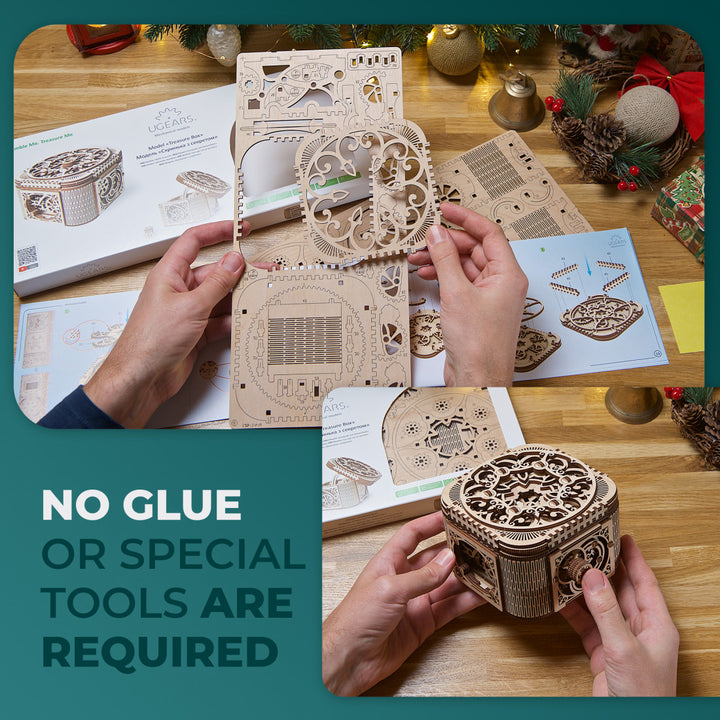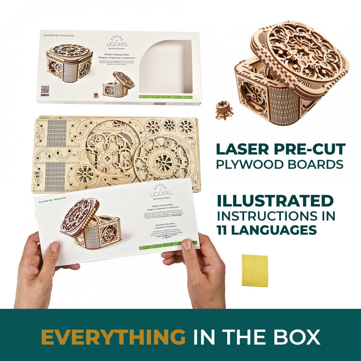 When all the secrets are revealed and the box is opened, inside you will find a small compartment for jewellery, notes and other small items. Ugears Mechanical Treasure Box set can become a perfect present on its own or – assembled by you – to contain a mysterious gift for your loved ones within.