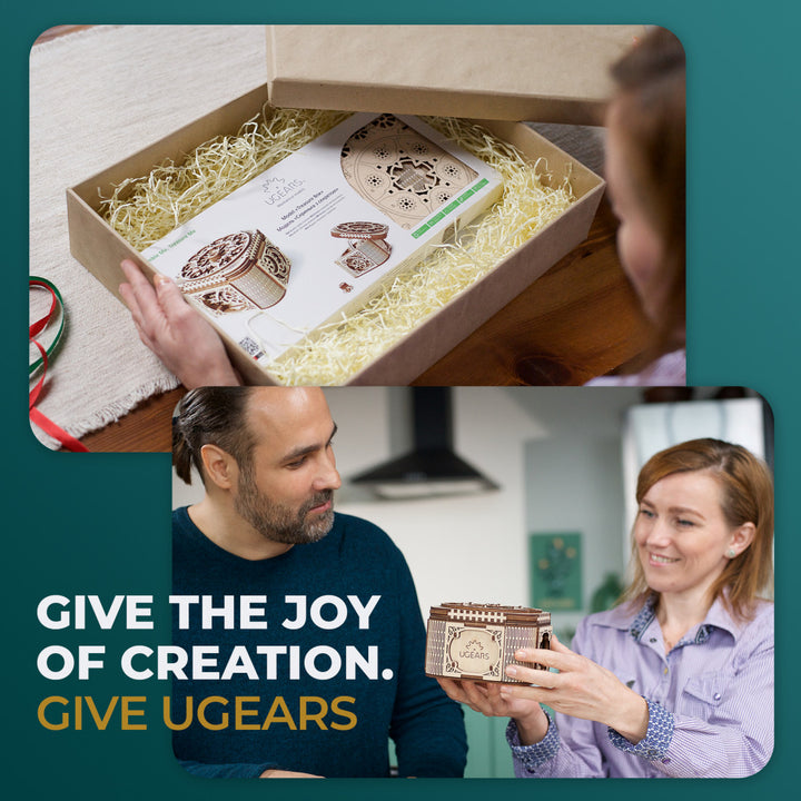 The true jewel of Ugears new collection of wooden models is an exquisite Mechanical Treasure Box for jewellery and notes. Mysterious and intriguing puzzle boxes, known in many cultures and especially popular in Victorian England, could not pass by our attention. Beautiful recognizable Ugears design and traditional step-by-step puzzle give you the Treasure Box – delight to the eye and food for brain.