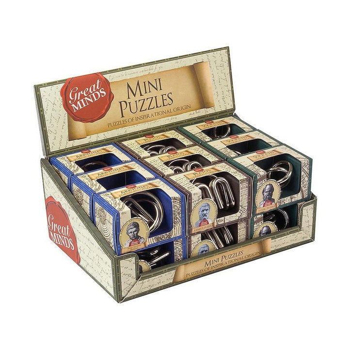 This display contains six each of three different 'Great Minds' metal puzzles. Separate the pieces - you'll be tinkering for ages trying to work out just how to do it. And after having done it once, that's no guarantee you can replicate the feat more easily the second time! There are six each of three types, including: