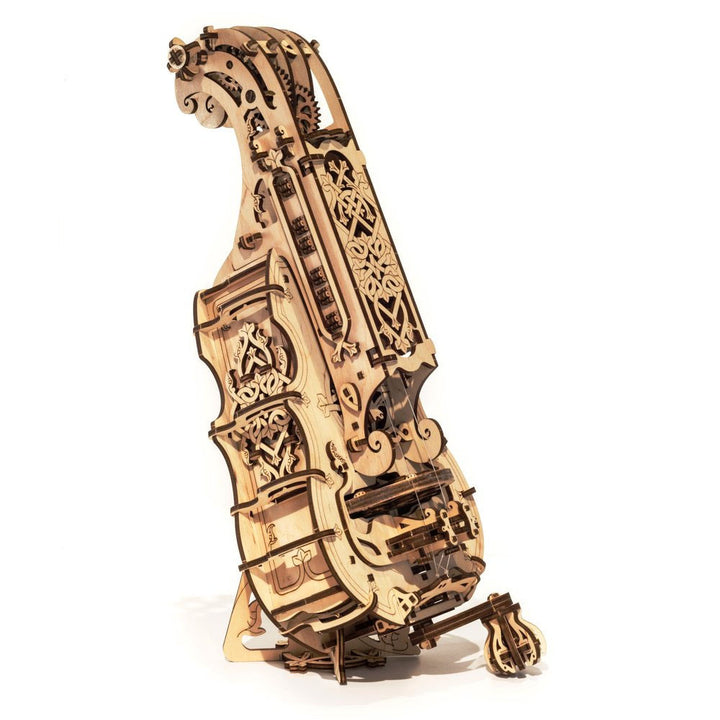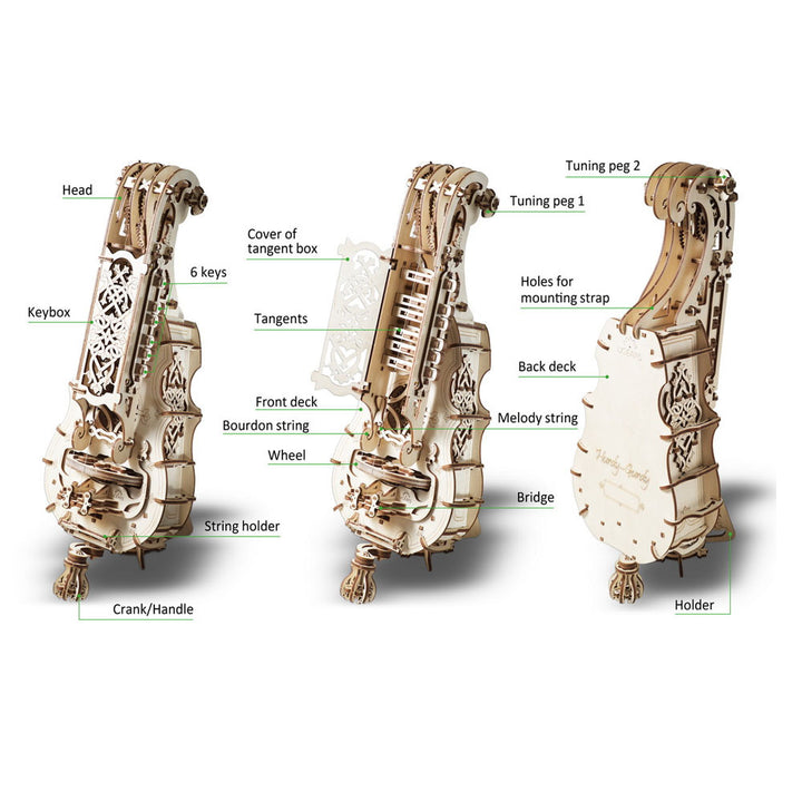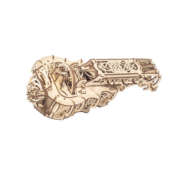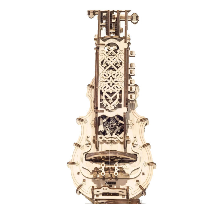 The history of this instrument begins in the 15th century. One of the earliest forms of the hurdy-gurdy was the organistrum (a portable organ) in Medieval Europe. After some modifications it became a common instrument among travelling musicians in England and went through its renaissance period in the later 17th-18th centuries as more of the noble class musical instrument for the amusement of the rich. Those instruments were decorated by craftsmen with inlays and carving and had the built-in hurdy-gurdy mechanism into the guitar or lute body. Some call the Hurdy-Gurdy music “a medieval rock’n’roll”, which we find pretty cool. It captured us and we decided to create the Ugears’ version of the Hurdy-Gurdy.