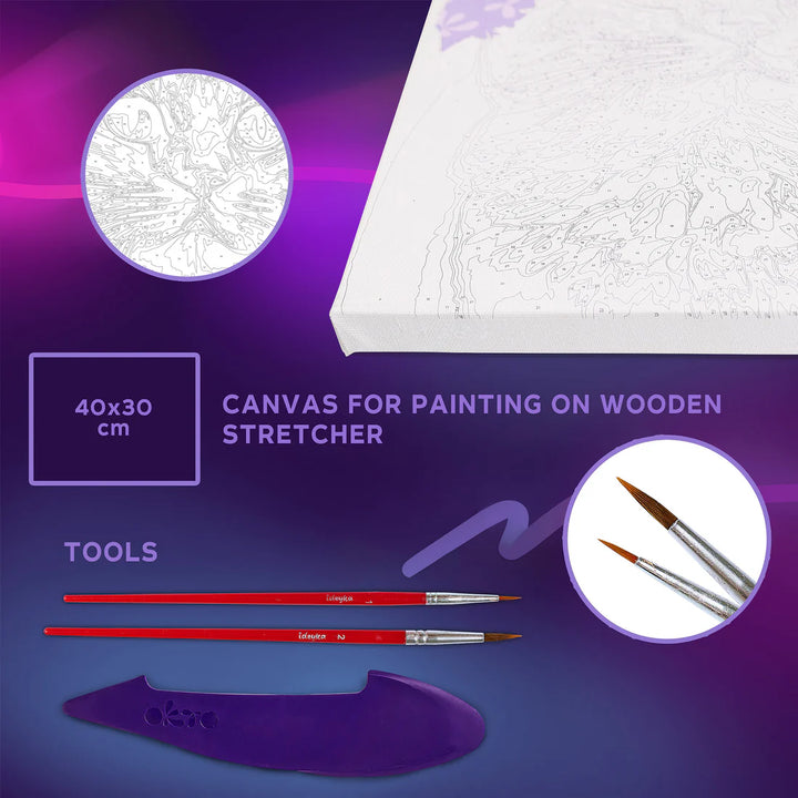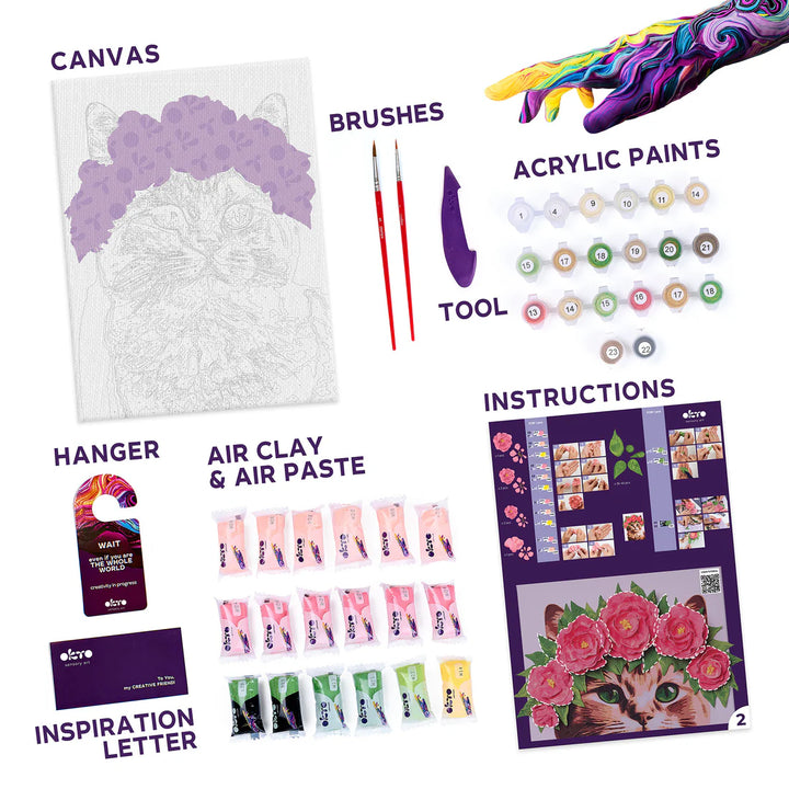 There's a certain magic in green cat eyes. One look, and you're enchanted, rushing to fill the food bowl and shower your cat with affection. But if you don't have a cat just yet, don't worry — you can bring one into your home with our painting kit. Paint a graceful cat with mesmerizing green eyes, then add a 3D flower crown made of vibrant clay to complete the picture.