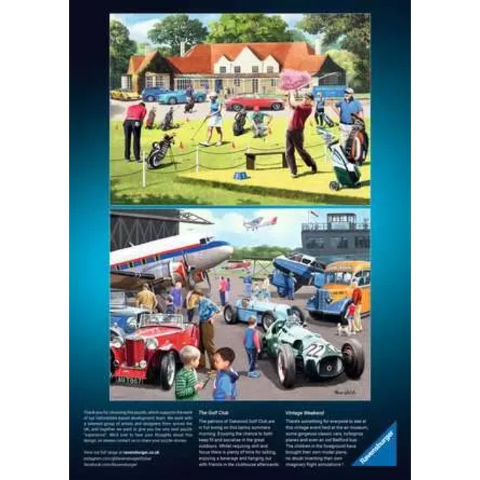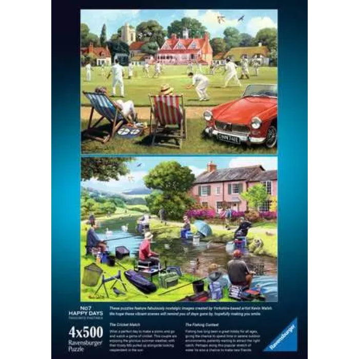 As you embark on the delightful journey of assembling this set of four 500 piece puzzles, you'll uncover the intricate details that make each scene come to life. The first puzzle whisks you away to the serene greens of a golf course, inviting you to relive the elegance and leisure of a bygone golfing era. The second puzzle invites you to step back in time as you piece together an idyllic scene of vintage cars lining a runway. The third puzzle transports you to a peaceful fishing spot by a tranquil lake, capturing the timeless joy of angling. The fourth puzzle captures the excitement of a cricket match, with players in traditional uniforms and spectators cheering from the sidelines, immersing you in the world of sportsmanship and camaraderie. Each puzzle, with its precise interlocking pieces, ensures a satisfying and immersive experience as the scenes gradually emerge under your fingertips. As you complete one puzzle after another, the nostalgic stories they tell unfold, celebrating the beauty of simpler times and cherished moments.
