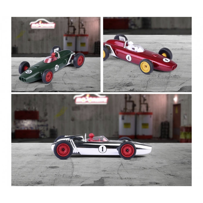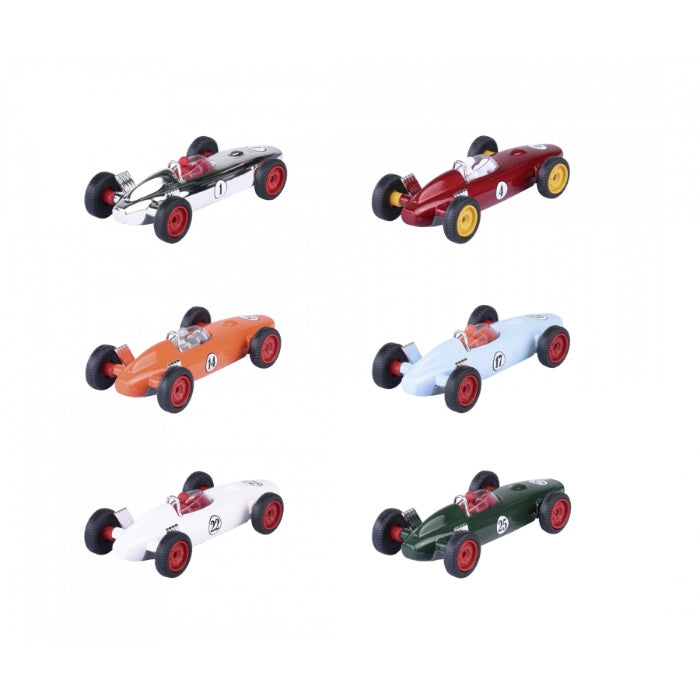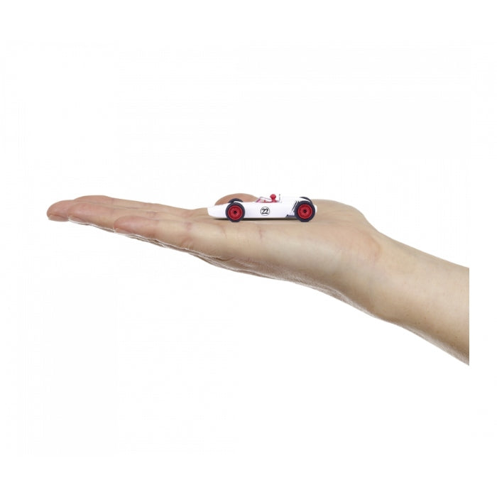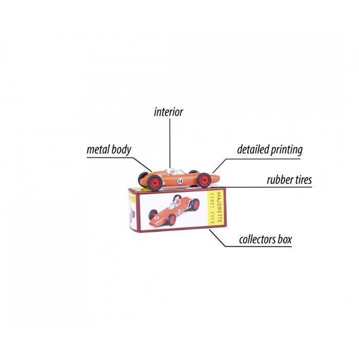 Majorette - ‘First Ever’ 60-year anniversary model car - Die-cast racing car with driver figure and rubber tires, car in 6 color variants (shipped at random), 7.5 cm, toy car with retro collector’s box