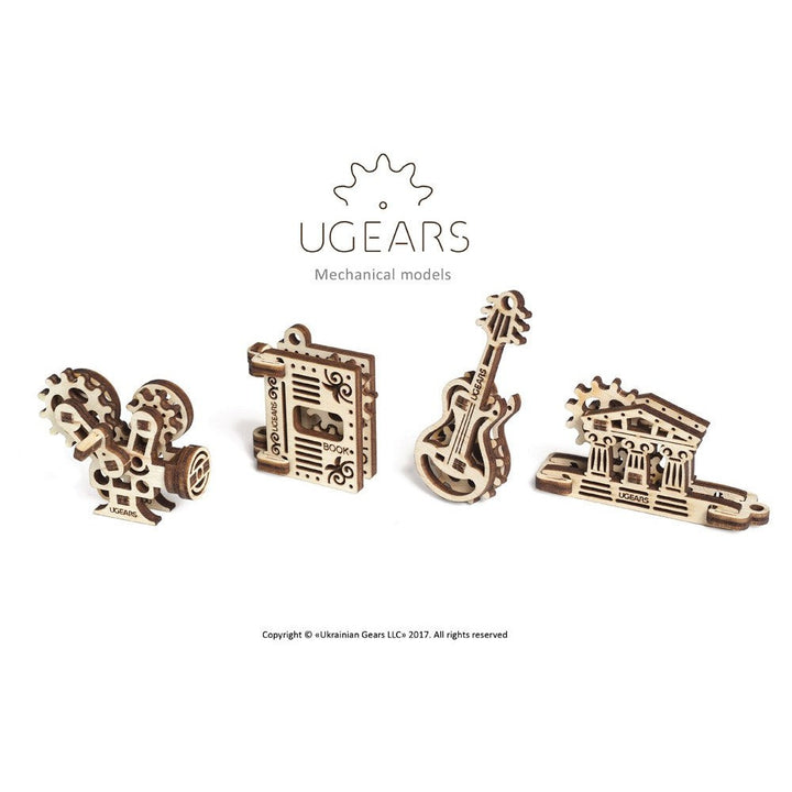 The unique 4 sets of the individual miniature Ugears models: Camera, Guitar, Book,