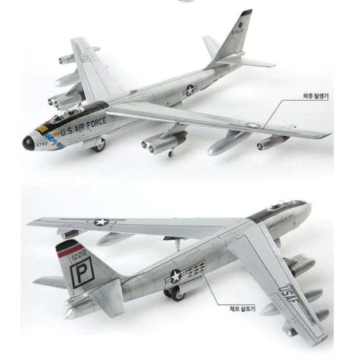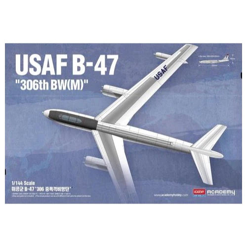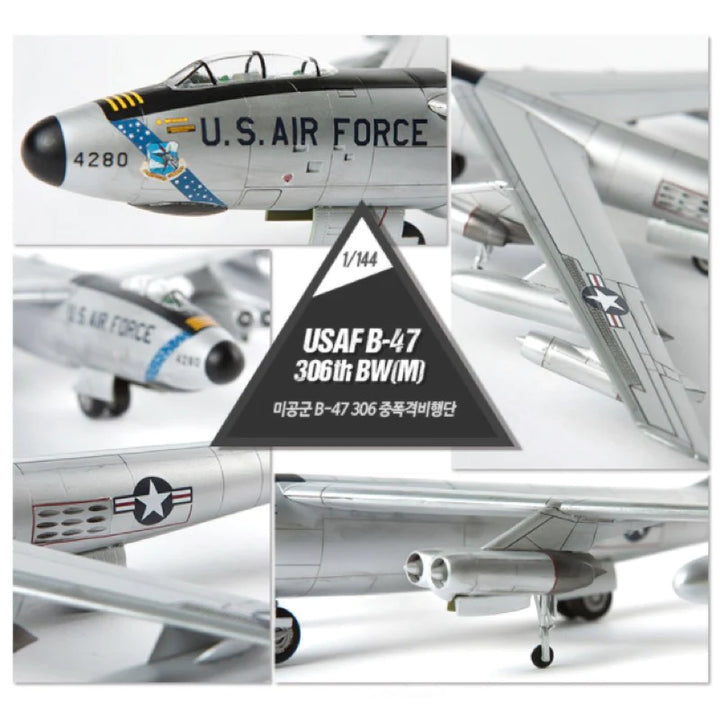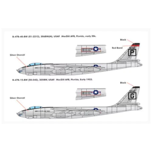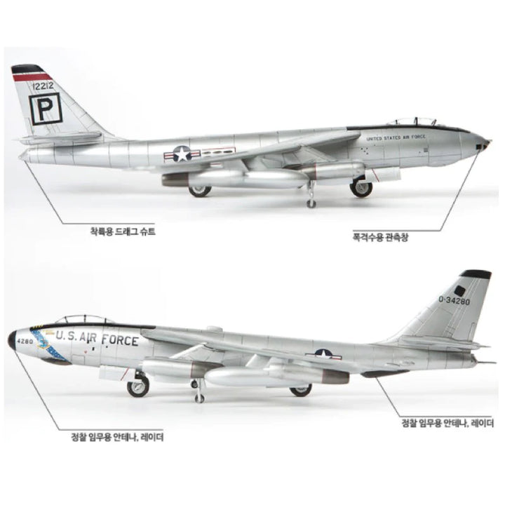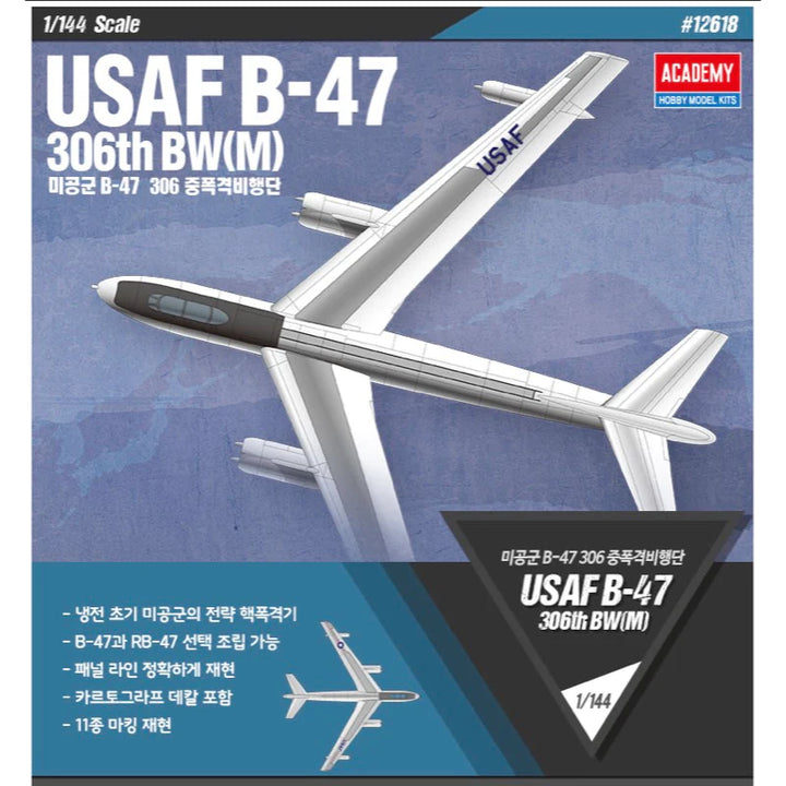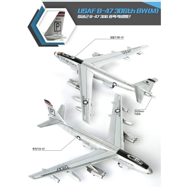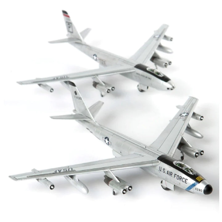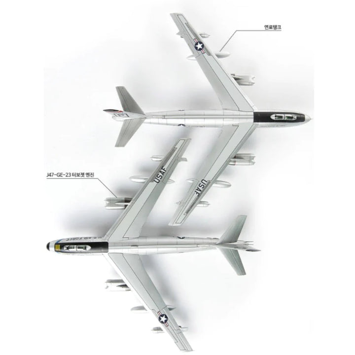 The B-47 was the first swept-wing jet bomber in the US Air Force's inventory, serving the USAF from 1951 to 1969. The US Navy flew some EB-47Es until 1977. Development began in 1943, and the design changed several times until Boeing came up with a 6-jet aircraft with the engines in pods under the wings. Because of the size of the engine pods, the main landing gear was set up as a "bicycle", with 2 main gear under the fuselage, and smaller outriggers under the engine pods. With this setup, the B-47 could not rotate the nose on takeoff. The main gear was set so the aircraft sat at optimum takeoff angle at all times. The B-47 was subsonic, but extremely fast for a 1950s, setting a number of time and distance records, with speeds around 600 miles per hour.