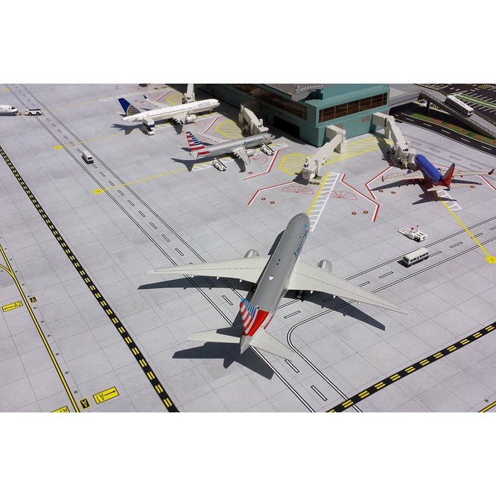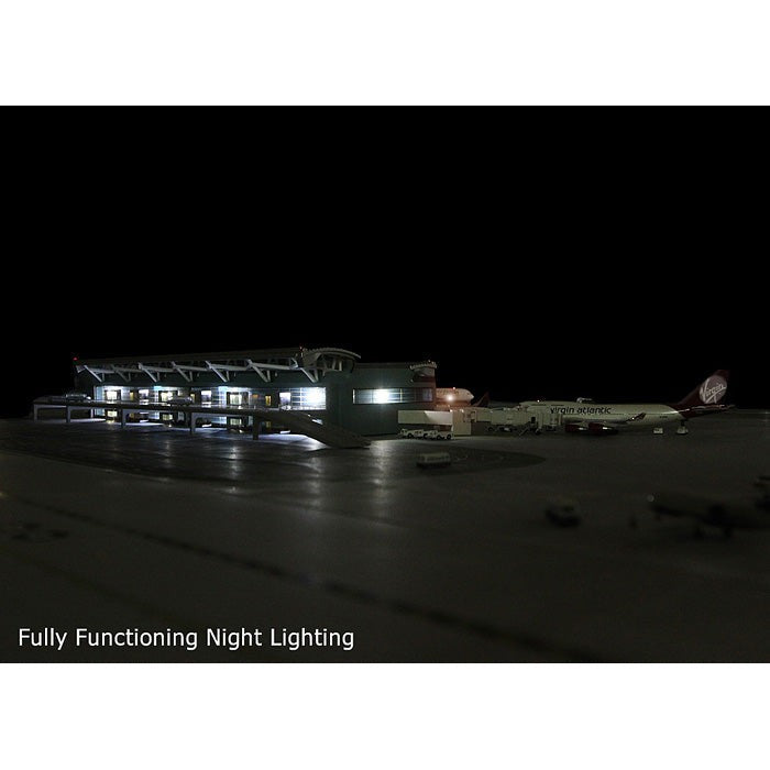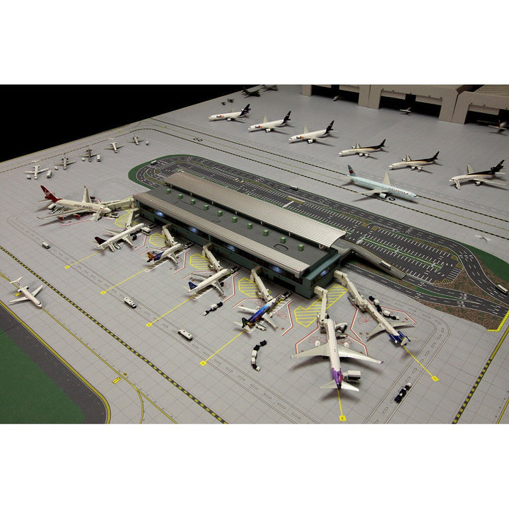 1:400 scale airport passenger terminal, featuring 7 moveable/adjustable air bridges, interior and exterior LED lighting + 1:400 scale durable airport ground mat set. This product contains the Airport Terminal Only (airport mat, hangars, and accessory vehicles sold separately; see our GeminiJets Airport section).