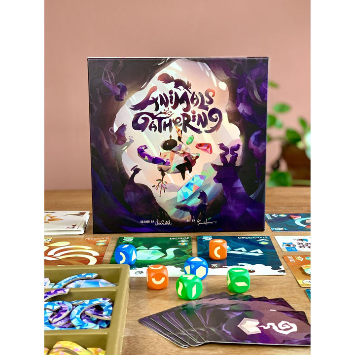 Animals Gathering is a dice family game for 2–5 players that incorporates dice management, tile placement, set collection, and push your luck elements. The goal is to earn the most points by placing Magic Stones (obtained via dice rolls) to fill in Animal Index Cards to revive animals, which provide powers and points as your companion.