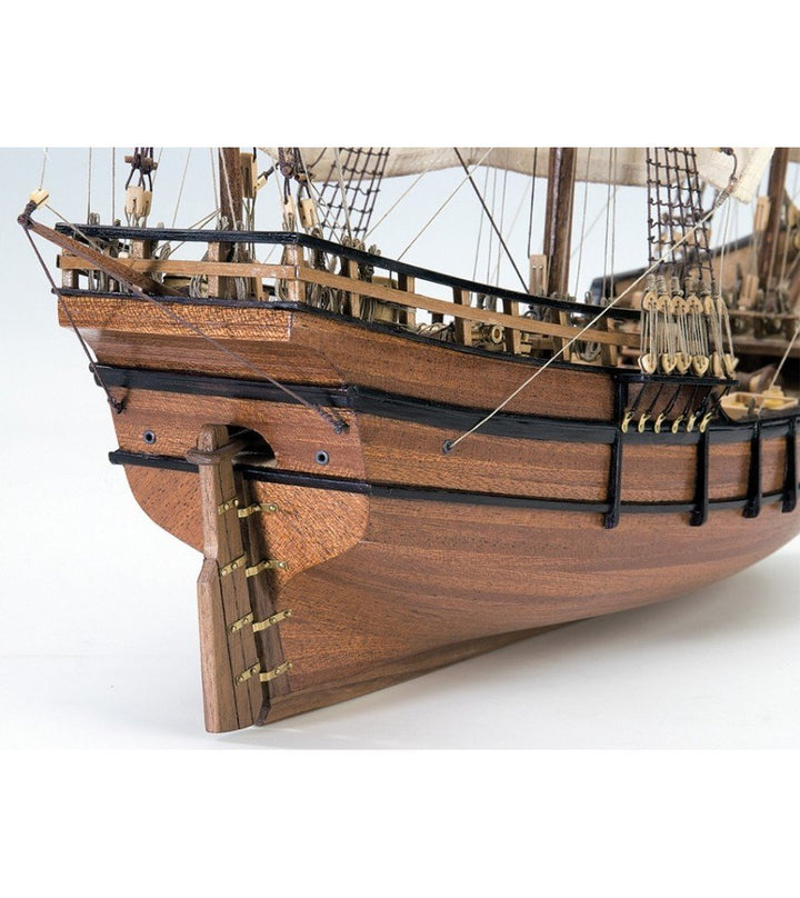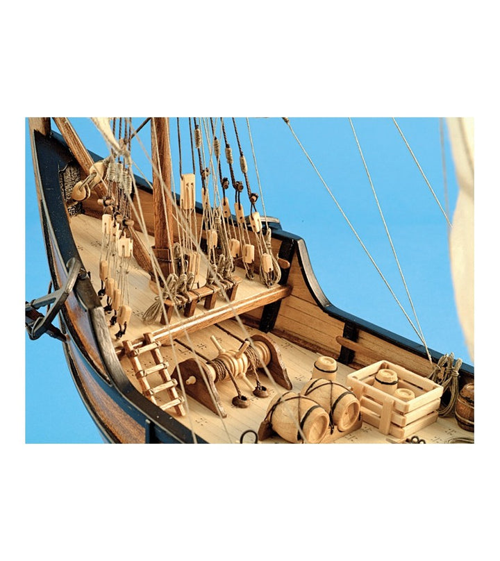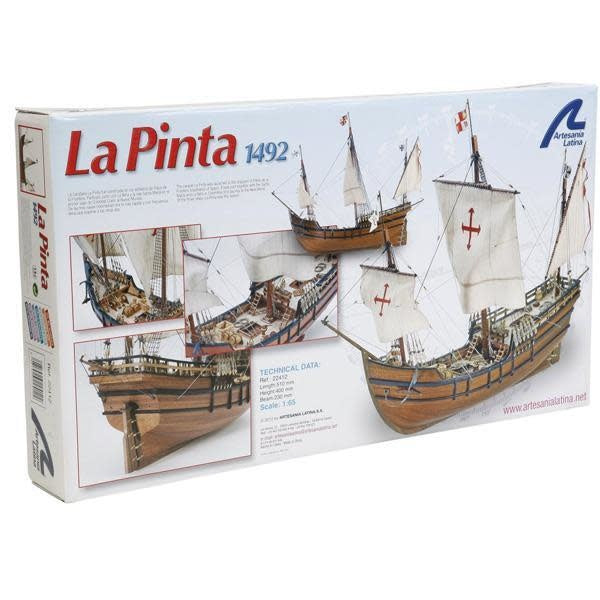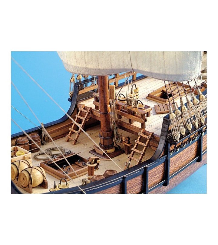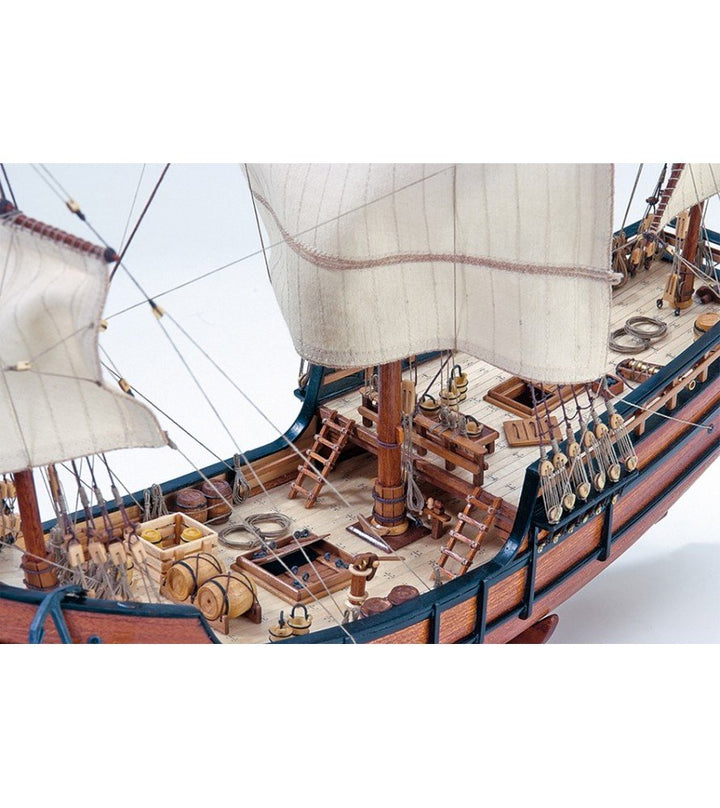 Wooden model ship of La Pinta caravel (15th Century) at 1/65 scale. This fabulous wooden model ship kit should be in your ship collection, along with the other two caravels from the Discovery of America. It contains high quality parts such as birch wood, photo-etched details, cotton sails ready to be placed and, as a gift, a wooden exhibition base with name plate. The model is aimed at modelers with an intermediate level of skills. Once it is built, this faithful miniature replica measures 20.07'' (510mm) length, 9.05'' (230mm) width and 15.74'' (400mm) height.