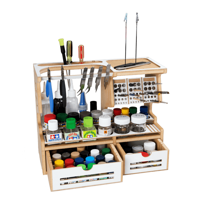 - A plastic model-making storage/stand of a compact size