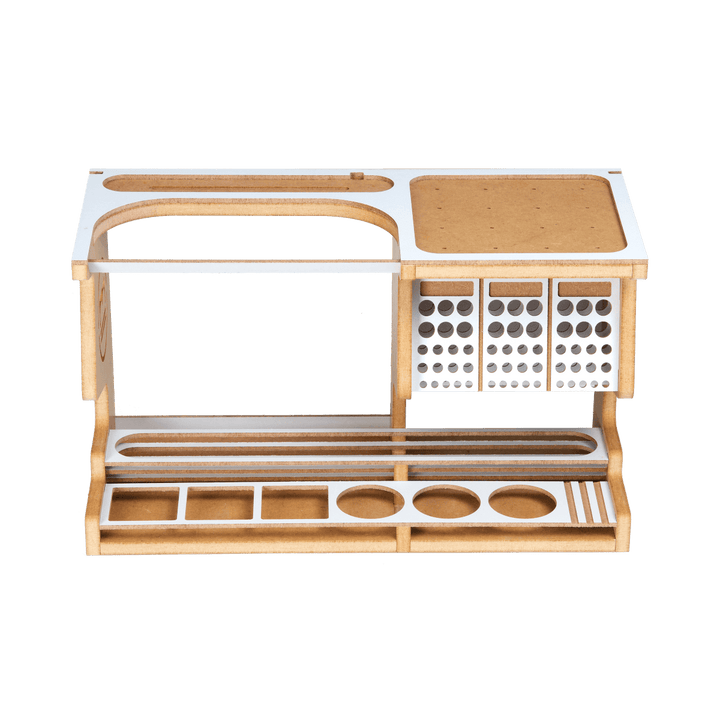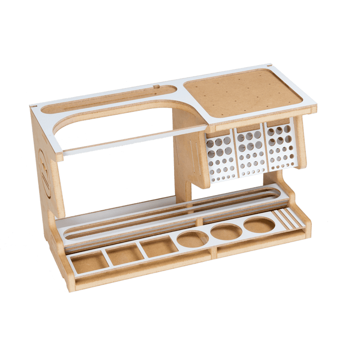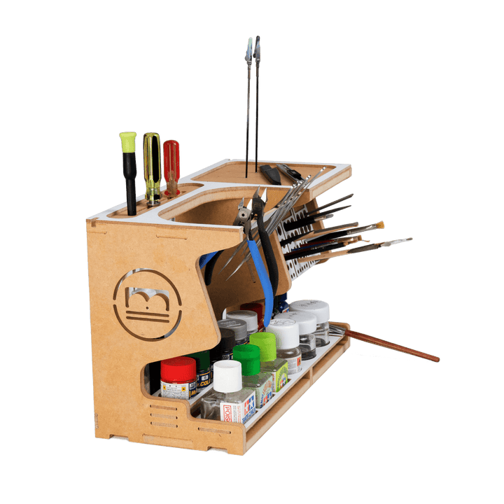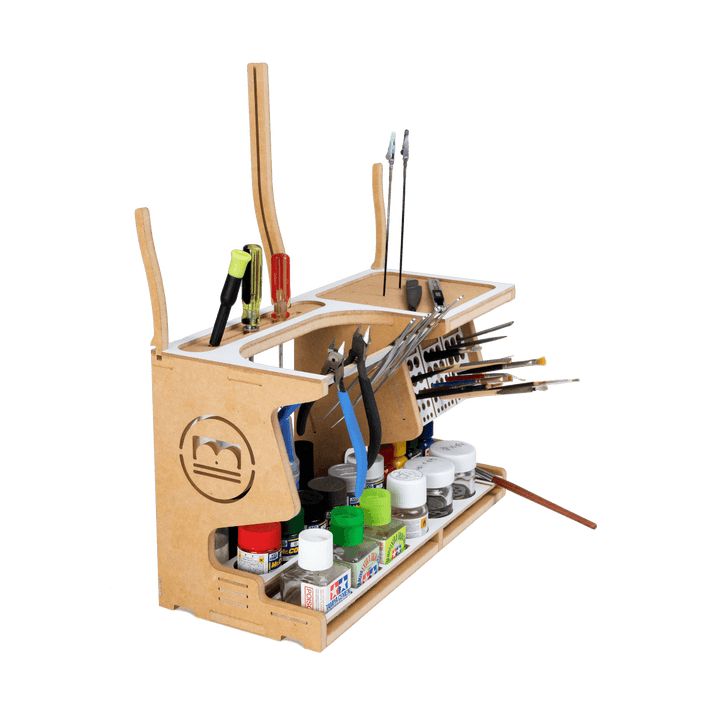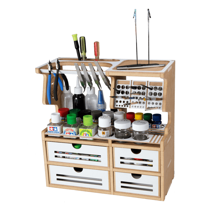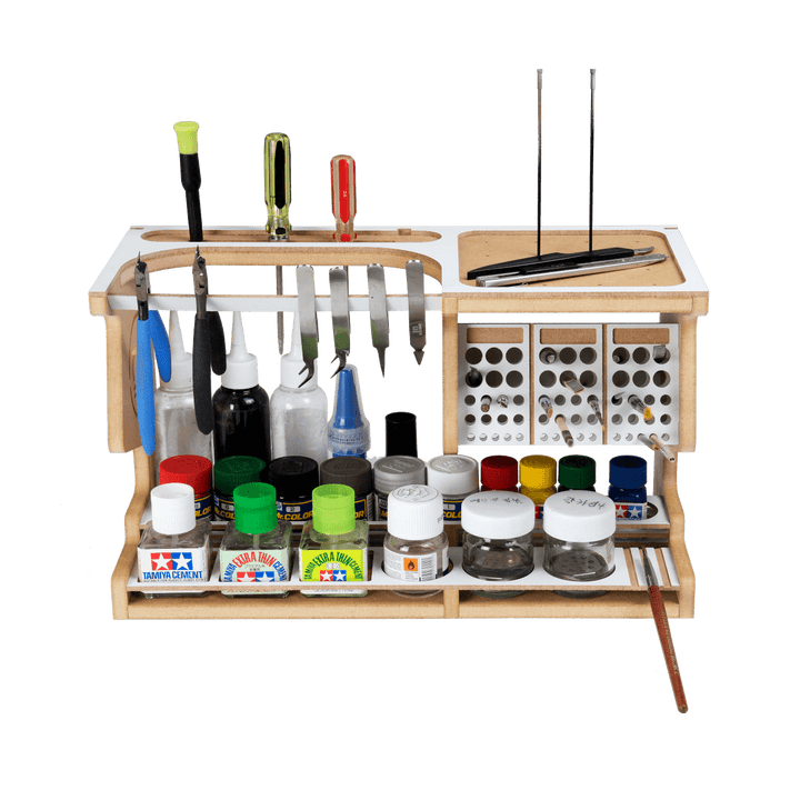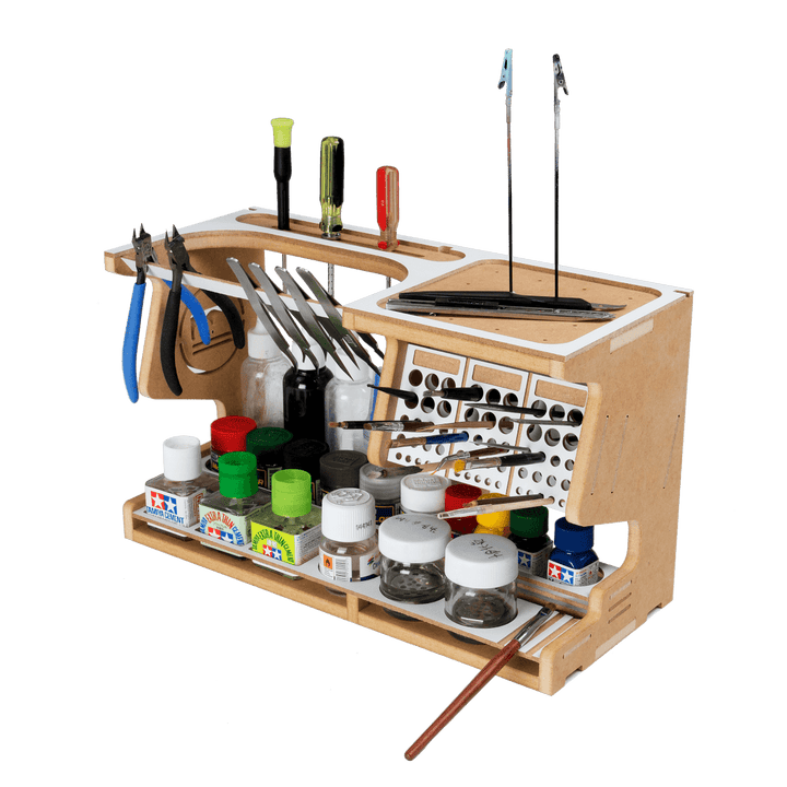 This product is a useful tool for making use of Hobby Model-kit and Gundam-kit. This product contains various functions such as Nipper/Tweezer Holder, Brush/Tool Holder, Paint shelf and Manual stand.